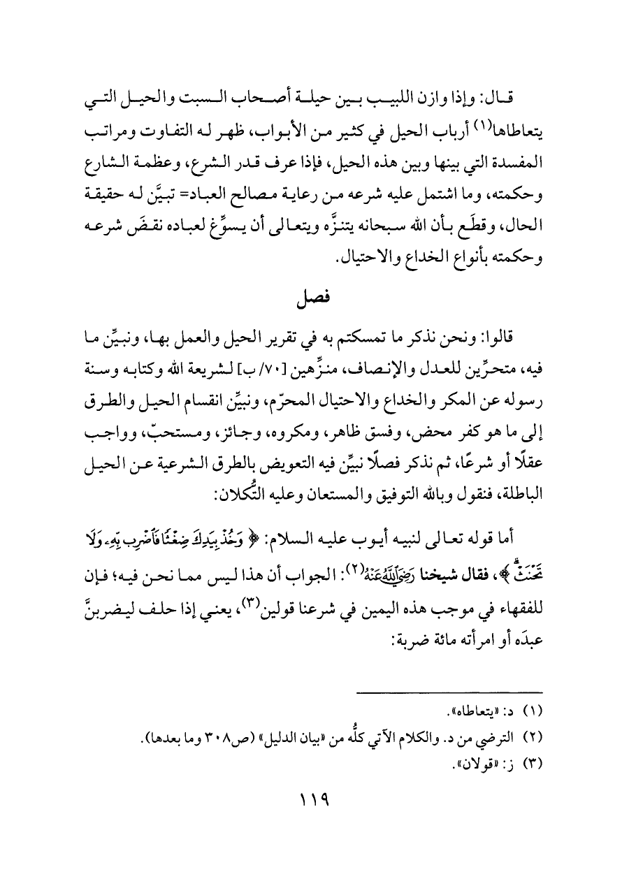 قالوا: ونحن نذكر ما تمسكتم به في تقرير الحيل والعمل بها، ونبيِّن ما فيه، متحرِّين للعدل والإنصاف، منزِّهين [٧٠/ب] لشريعة الله وكتابه وسنة رسوله عن المكر والخداع والاحتيال المحرّم، ونبيِّن انقسام الحيل والطرق إلى ما هو كفر محض، وفسق ظاهر، ومكروه، وجائز، ومستحبّ، وواجب عقلًا أو شرعًا، ثم نذكر فصلًا نبيِّن فيه التعويض بالطرق الشرعية عن الحيل الباطلة، فنقول وبالله التوفيق والمستعان وعليه التُّكلان: