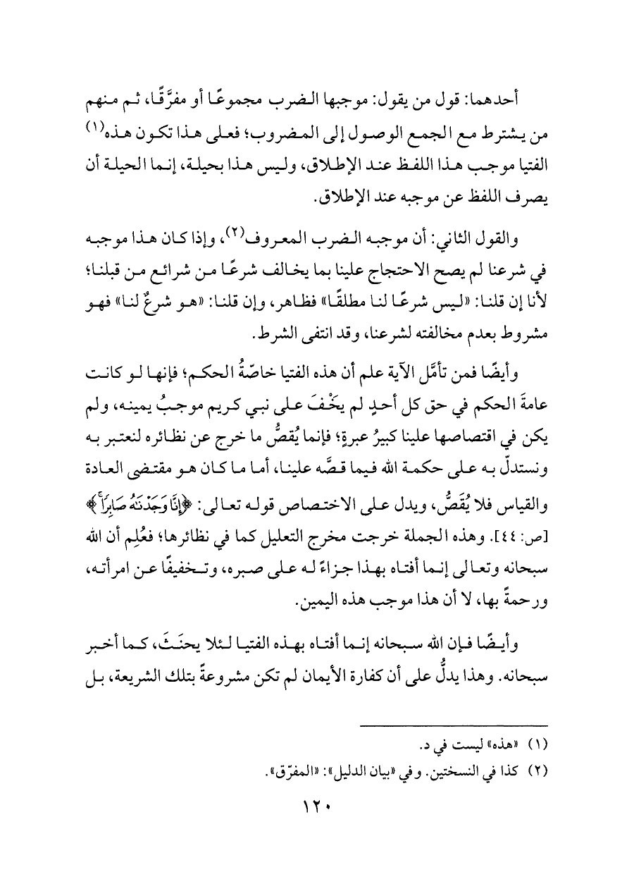 وأيضًا فمن تأمَّل الآية علم أن هذه الفتيا خاصّةُ الحكم؛ فإنها لو كانت عامةَ الحكم في حق كل أحدٍ لم يَخْفَ على نبي كريم موجبُ يمينه، ولم يكن في اقتصاصها علينا كبيرُ عبرةٍ؛ فإنما يُقصُّ ما خرج عن نظائره لنعتبر به ونستدلّ به على حكمة الله فيما قصَّه علينا، أما ما كان هو مقتضى العادة والقياس فلا يُقَصُّ، ويدل على الاختصاص قوله تعالى: {إِنَّا وَجَدْنَاهُ صَابِرًا} [ص: ٤٤]. وهذه الجملة خرجت مخرج التعليل كما في نظائرها؛ فعُلِم أن الله سبحانه وتعالى إنما أفتاه بهذا جزاءً له على صبره، وتخفيفًا عن امرأته، ورحمةً بها، لا أن هذا موجب هذه اليمين.