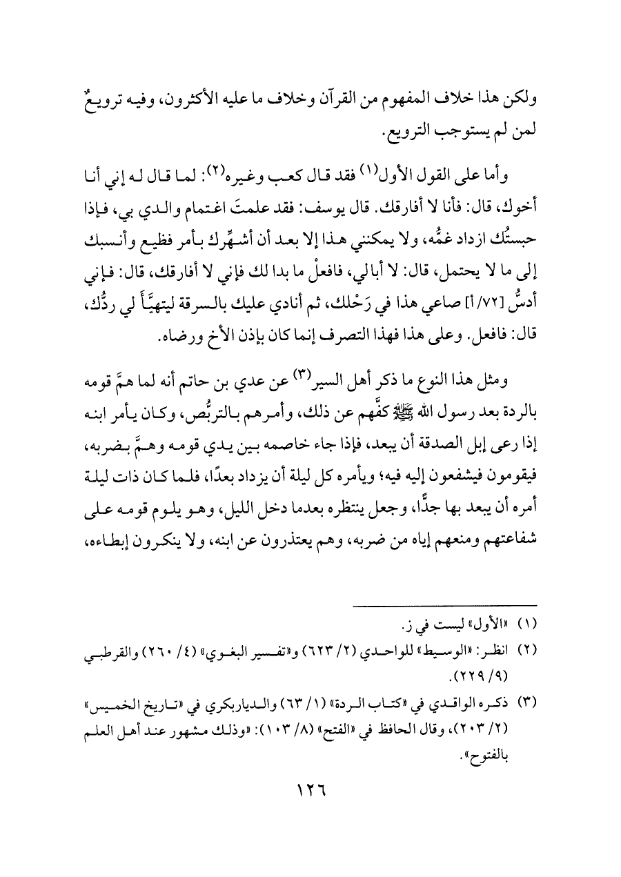 ومثل هذا النوع ما ذكر أهل السير (¬٣) عن عدي بن حاتم أنه لما همَّ قومه بالردة بعد رسول الله - صلى الله عليه وسلم - كفَّهم عن ذلك، وأمرهم بالتربُّص، وكان يأمر ابنه إذا رعى إبل الصدقة أن يبعد، فإذا جاء خاصمه بين يدي قومه وهمَّ بضربه، فيقومون فيشفعون إليه فيه؛ ويأمره كل ليلة أن يزداد بعدًا، فلما كان ذات ليلة أمره أن يبعد بها جدًّا، وجعل ينتظره بعدما دخل الليل، وهو يلوم قومه على شفاعتهم ومنعهم إياه من ضربه، وهم يعتذرون عن ابنه، ولا ينكرون إبطاءه،