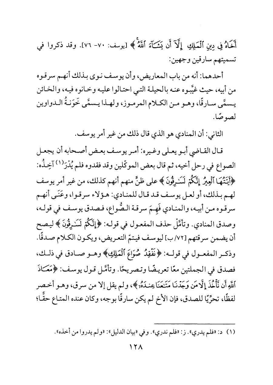 أَخَاهُ فِي دِينِ الْمَلِكِ إِلَّا أَنْ يَشَاءَ اللَّهُ} [يوسف: ٧٠ - ٧٦]. وقد ذكروا في تسميتهم سارقين وجهين: