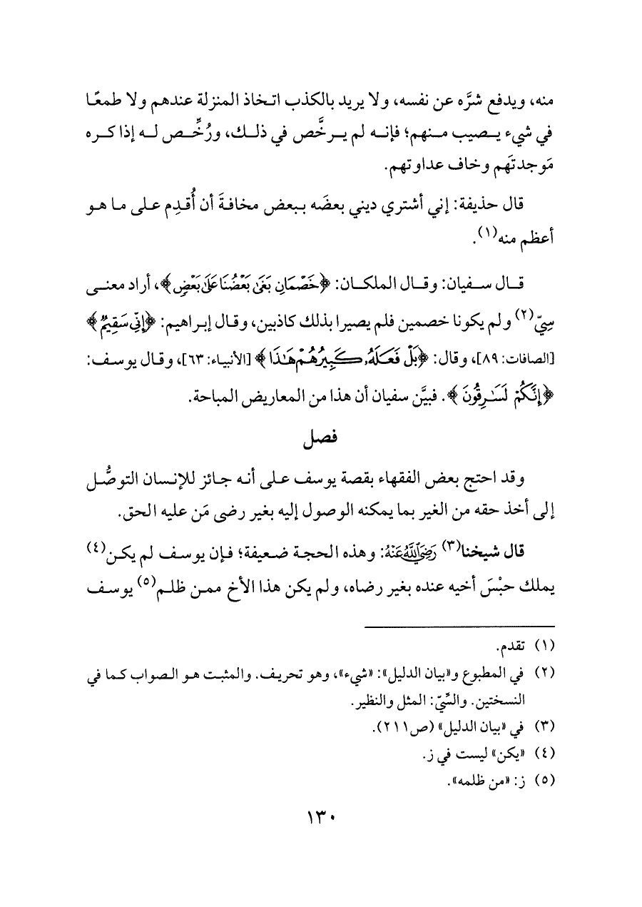 قال سفيان: وقال الملكان: {خَصْمَانِ بَغَى بَعْضُنَا عَلَى بَعْضٍ}، أراد معنى سِيّ (¬٢) ولم يكونا خصمين فلم يصيرا بذلك كاذبين، وقال إبراهيم: {إِنِّي سَقِيمٌ} [الصافات: ٨٩]، وقال: {بَلْ فَعَلَهُ كَبِيرُهُمْ هَذَا} [الأنبياء: ٦٣]، وقال يوسف: {إِنَّكُمْ لَسَارِقُونَ}. فبيَّن سفيان أن هذا من المعاريض المباحة.