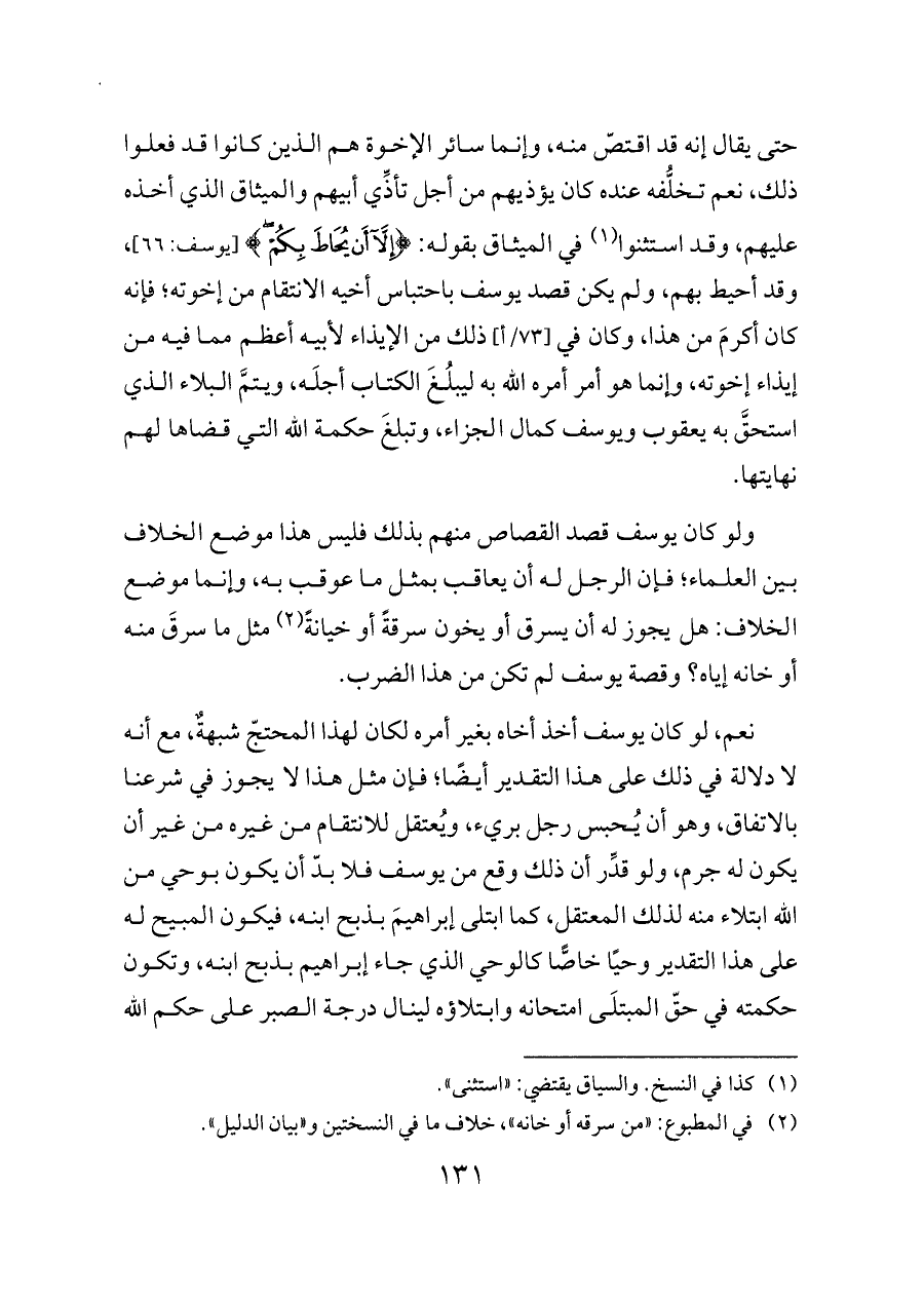 نعم، لو كان يوسف أخذ أخاه بغير أمره لكان لهذا المحتجّ شبهةٌ، مع أنه لا دلالة في ذلك على هذا التقدير أيضًا؛ فإن مثل هذا لا يجوز في شرعنا بالاتفاق، وهو أن يُحبس رجل بريء، ويُعتقل للانتقام من غيره من غير أن يكون له جرم، ولو قدِّر أن ذلك وقع من يوسف فلا بدّ أن يكون بوحي من الله ابتلاء منه لذلك المعتقل، كما ابتلى إبراهيمَ بذبح ابنه، فيكون المبيح له على هذا التقدير وحيًا خاصًّا كالوحي الذي جاء إبراهيم بذبح ابنه، وتكون حكمته في حقّ المبتلَى امتحانه وابتلاؤه لينال درجة الصبر على حكم الله