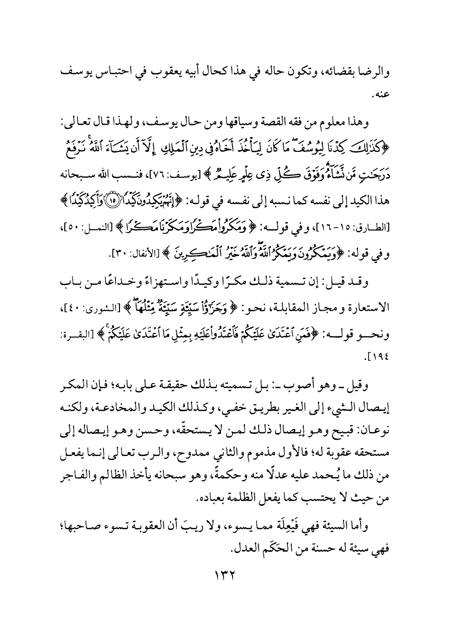 وهذا معلوم من فقه القصة وسياقها ومن حال يوسف، ولهذا قال تعالى: {كَذَلِكَ كِدْنَا لِيُوسُفَ مَا كَانَ لِيَأْخُذَ أَخَاهُ فِي دِينِ الْمَلِكِ إِلَّا أَنْ يَشَاءَ اللَّهُ نَرْفَعُ دَرَجَاتٍ مَنْ نَشَاءُ وَفَوْقَ كُلِّ ذِي عِلْمٍ عَلِيمٌ} [يوسف: ٧٦]، فنسب الله سبحانه هذا الكيد إلى نفسه كما نسبه إلى نفسه في قوله: {إِنَّهُمْ يَكِيدُونَ كَيْدًا (١٥) وَأَكِيدُ كَيْدًا} [الطارق: ١٥ - ١٦]، وفي قوله: {وَمَكَرُوا مَكْرًا وَمَكَرْنَا مَكْرًا} [النمل: ٥٠]، وفي قوله: {وَيَمْكُرُونَ وَيَمْكُرُ اللَّهُ وَاللَّهُ خَيْرُ الْمَاكِرِينَ} [الأنفال: ٣٠].