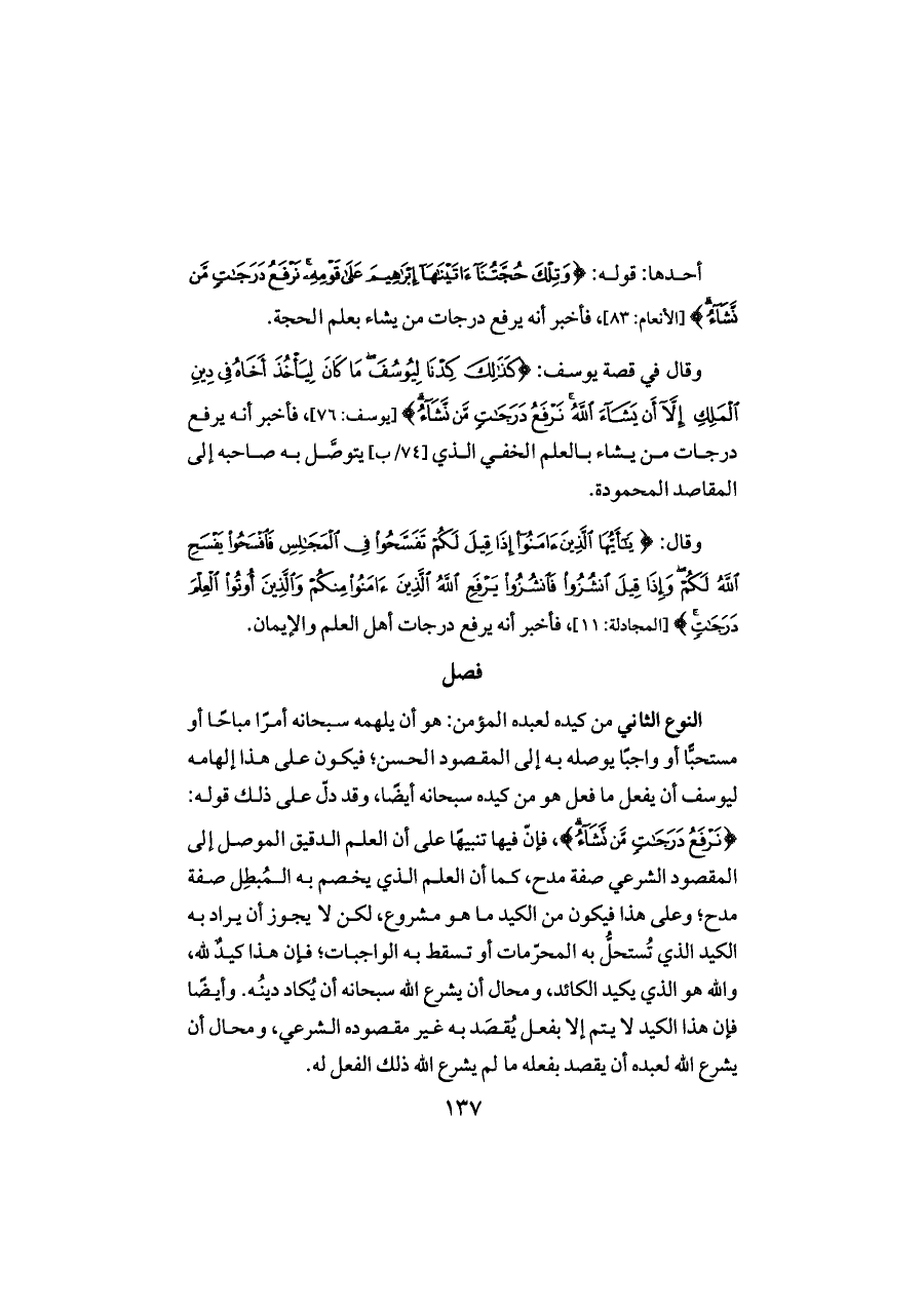 وقال في قصة يوسف: {كَذَلِكَ كِدْنَا لِيُوسُفَ مَا كَانَ لِيَأْخُذَ أَخَاهُ فِي دِينِ الْمَلِكِ إِلَّا أَنْ يَشَاءَ اللَّهُ نَرْفَعُ دَرَجَاتٍ مَنْ نَشَاءُ} [يوسف: ٧٦]، فأخبر أنه يرفع درجات من يشاء بالعلم الخفي الذي [٧٤/ب] يتوصَّل به صاحبه إلى المقاصد المحمودة.