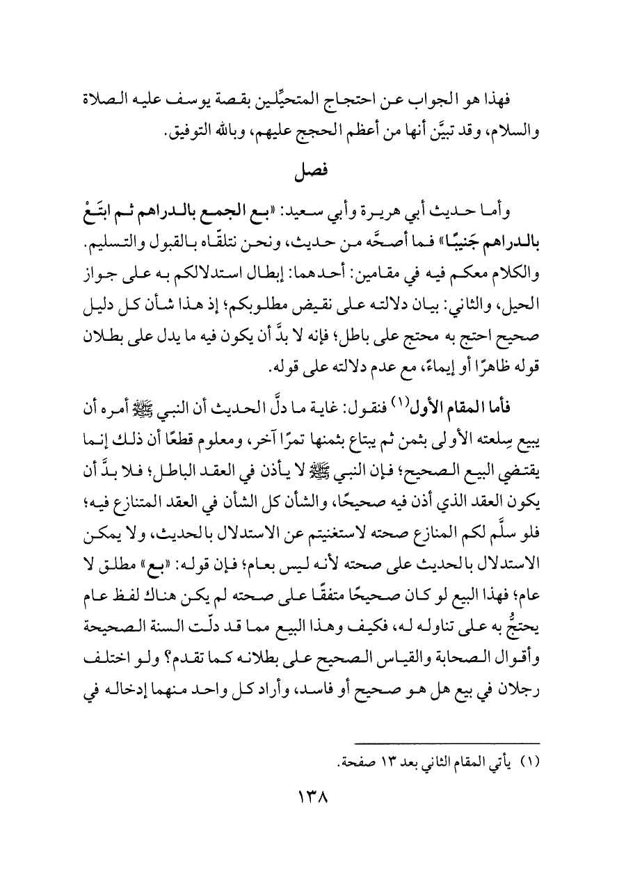 وأما حديث أبي هريرة وأبي سعيد: «بع الجمع بالدراهم ثم ابتَعْ بالدراهم جَنيبًا» فما أصحَّه من حديث، ونحن نتلقّاه بالقبول والتسليم. والكلام معكم فيه في مقامين: أحدهما: إبطال استدلالكم به على جواز الحيل، والثاني: بيان دلالته على نقيض مطلوبكم؛ إذ هذا شأن كل دليل صحيح احتج به محتج على باطل؛ فإنه لا بدَّ أن يكون فيه ما يدل على بطلان قوله ظاهرًا أو إيماءً، مع عدم دلالته على قوله.