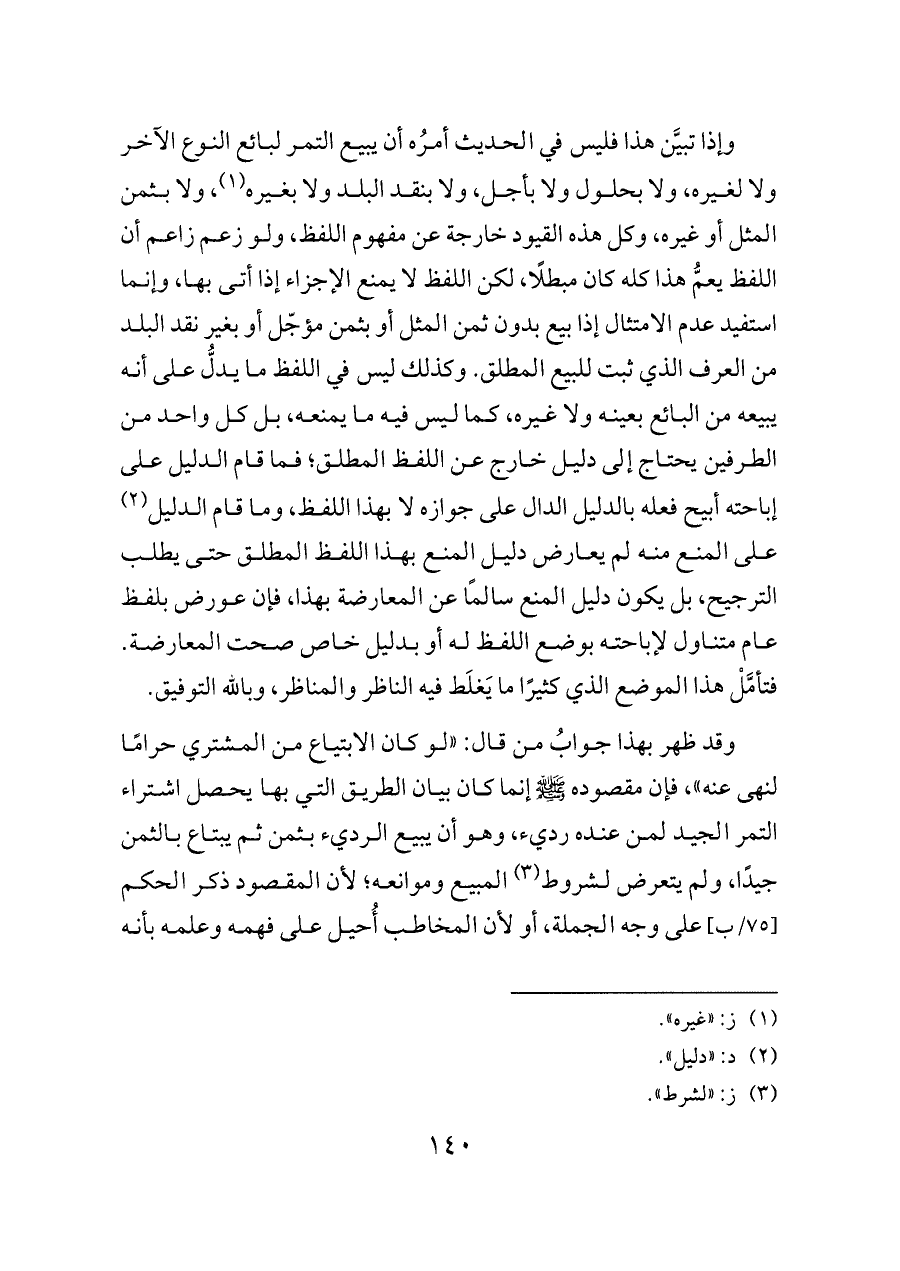 وإذا تبيَّن هذا فليس في الحديث أمرُه أن يبيع التمر لبائع النوع الآخر ولا لغيره، ولا بحلول ولا بأجل، ولا بنقد البلد ولا بغيره (¬١)، ولا بثمن المثل أو غيره، وكل هذه القيود خارجة عن مفهوم اللفظ، ولو زعم زاعم أن اللفظ يعمُّ هذا كله كان مبطلًا، لكن اللفظ لا يمنع الإجزاء إذا أتى بها، وإنما استفيد عدم الامتثال إذا بيع بدون ثمن المثل أو بثمن مؤجّل أو بغير نقد البلد من العرف الذي ثبت للبيع المطلق. وكذلك ليس في اللفظ ما يدلُّ على أنه يبيعه من البائع بعينه ولا غيره، كما ليس فيه ما يمنعه، بل كل واحد من الطرفين يحتاج إلى دليل خارج عن اللفظ المطلق؛ فما قام الدليل على إباحته أبيح فعله بالدليل الدال على جوازه لا بهذا اللفظ، وما قام الدليل (¬٢) على المنع منه لم يعارض دليل المنع بهذا اللفظ المطلق حتى يطلب الترجيح، بل يكون دليل المنع سالمًا عن المعارضة بهذا، فإن عورض بلفظ عام متناول لإباحته بوضع اللفظ له أو بدليل خاص صحت المعارضة. فتأمَّلْ هذا الموضع الذي كثيرًا ما يَغلَط فيه الناظر والمناظر، وبالله التوفيق.