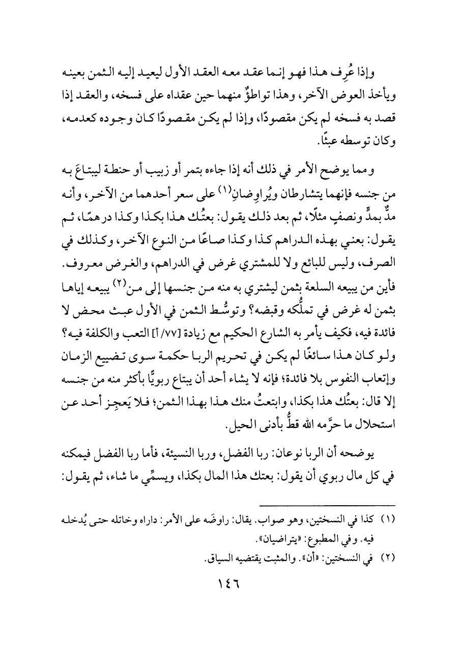 ومما يوضح الأمر في ذلك أنه إذا جاءه بتمر أو زبيب أو حنطة ليبتاعَ به من جنسه فإنهما يتشارطان ويُراوِضانِ (¬١) على سعر أحدهما من الآخر، وأنه مدٌّ بمدٍّ ونصفٍ مثلًا، ثم بعد ذلك يقول: بعتُك هذا بكذا وكذا درهمًا، ثم يقول: بعني بهذه الدراهم كذا وكذا صاعًا من النوع الآخر، وكذلك في الصرف، وليس للبائع ولا للمشتري غرض في الدراهم، والغرض معروف. فأين من يبيعه السلعة بثمن ليشتري به منه من جنسها إلى من (¬٢) يبيعه إياها بثمن له غرض في تملُّكه وقبضه؟ وتوسُّط الثمن في الأول عبث محض لا فائدة فيه، فكيف يأمر به الشارع الحكيم مع زيادة [٧٧/أ] التعب والكلفة فيه؟ ولو كان هذا سائغًا لم يكن في تحريم الربا حكمة سوى تضييع الزمان وإتعاب النفوس بلا فائدة؛ فإنه لا يشاء أحد أن يبتاع ربويًّا بأكثر منه من جنسه إلا قال: بعتُك هذا بكذا، وابتعتُ منك هذا بهذا الثمن؛ فلا يَعجِز أحد عن استحلال ما حرَّمه الله قطُّ بأدنى الحيل.