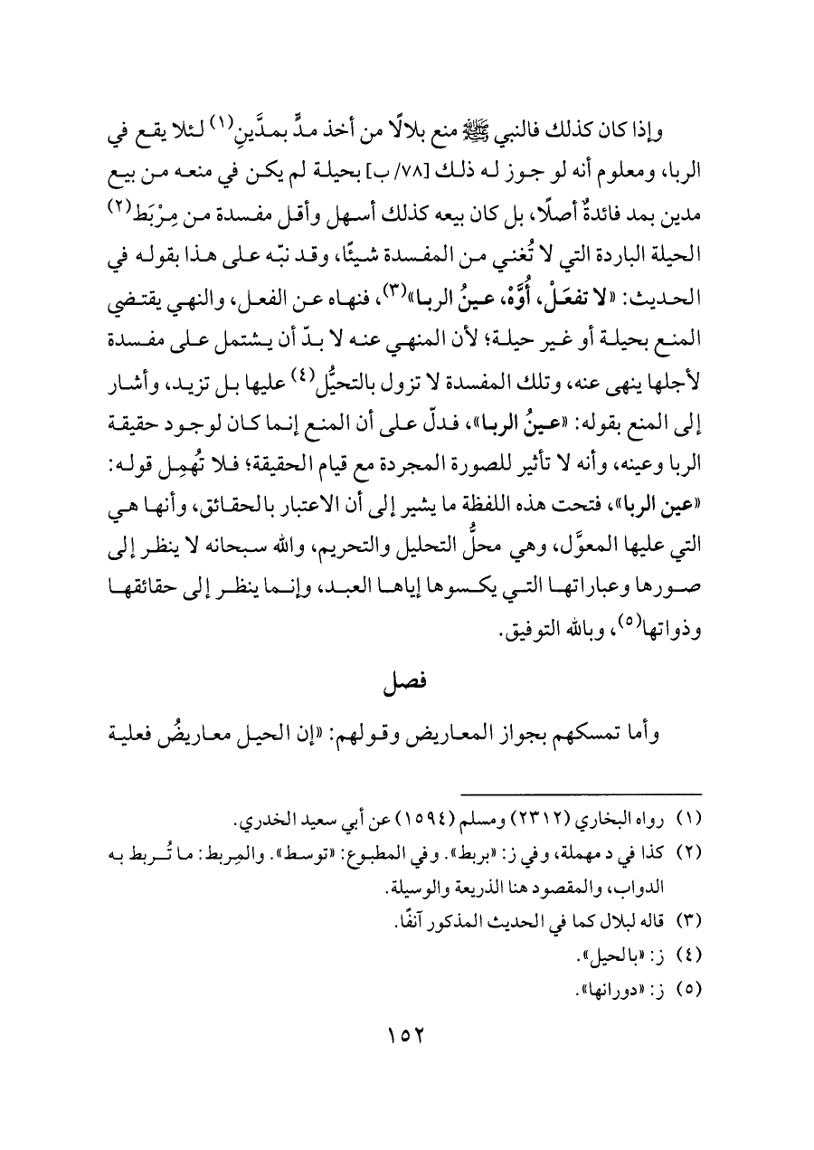 وإذا كان كذلك فالنبي - صلى الله عليه وسلم - منع بلالًا من أخذ مدٍّ بمدَّينِ (¬١) لئلا يقع في الربا، ومعلوم أنه لو جوز له ذلك [٧٨/ب] بحيلة لم يكن في منعه من بيع مدين بمد فائدةٌ أصلًا، بل كان بيعه كذلك أسهل وأقل مفسدة من مِرْبَط (¬٢) الحيلة الباردة التي لا تُغني من المفسدة شيئًا، وقد نبّه على هذا بقوله في الحديث: «لا تفعَلْ، أُوَّهْ، عينُ الربا» (¬٣)، فنهاه عن الفعل، والنهي يقتضي المنع بحيلة أو غير حيلة؛ لأن المنهي عنه لا بدّ أن يشتمل على مفسدة لأجلها ينهى عنه، وتلك المفسدة لا تزول بالتحيُّل (¬٤) عليها بل تزيد، وأشار إلى المنع بقوله: «عينُ الربا»، فدلّ على أن المنع إنما كان لوجود حقيقة الربا وعينه، وأنه لا تأثير للصورة المجردة مع قيام الحقيقة؛ فلا تُهمِل قوله: «عين الربا»، فتحت هذه اللفظة ما يشير إلى أن الاعتبار بالحقائق، وأنها هي التي عليها المعوَّل، وهي محلُّ التحليل والتحريم، والله سبحانه لا ينظر إلى صورها وعباراتها التي يكسوها إياها العبد، وإنما ينظر إلى حقائقها وذواتها (¬٥)، وبالله التوفيق.