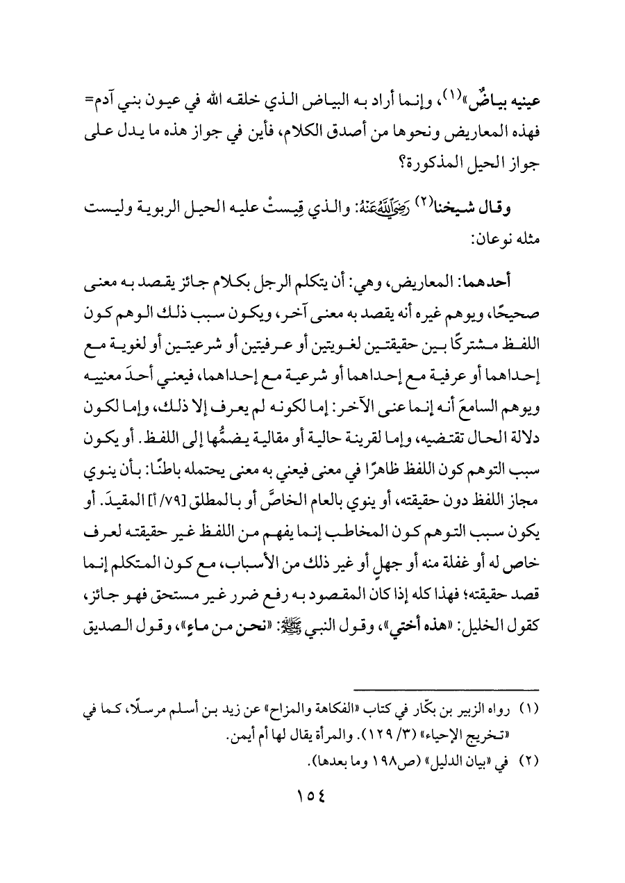 عينيه بياضٌ» (¬١)، وإنما أراد به البياض الذي خلقه الله في عيون بني آدم= فهذه المعاريض ونحوها من أصدق الكلام، فأين في جواز هذه ما يدل على جواز الحيل المذكورة؟
