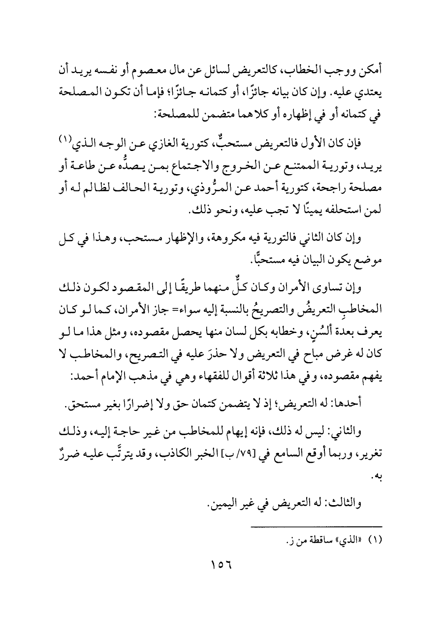 أمكن ووجب الخطاب، كالتعريض لسائل عن مال معصوم أو نفسه يريد أن يعتدي عليه. وإن كان بيانه جائزًا، أو كتمانه جائزًا؛ فإما أن تكون المصلحة في كتمانه أو في إظهاره أو كلاهما متضمن للمصلحة: