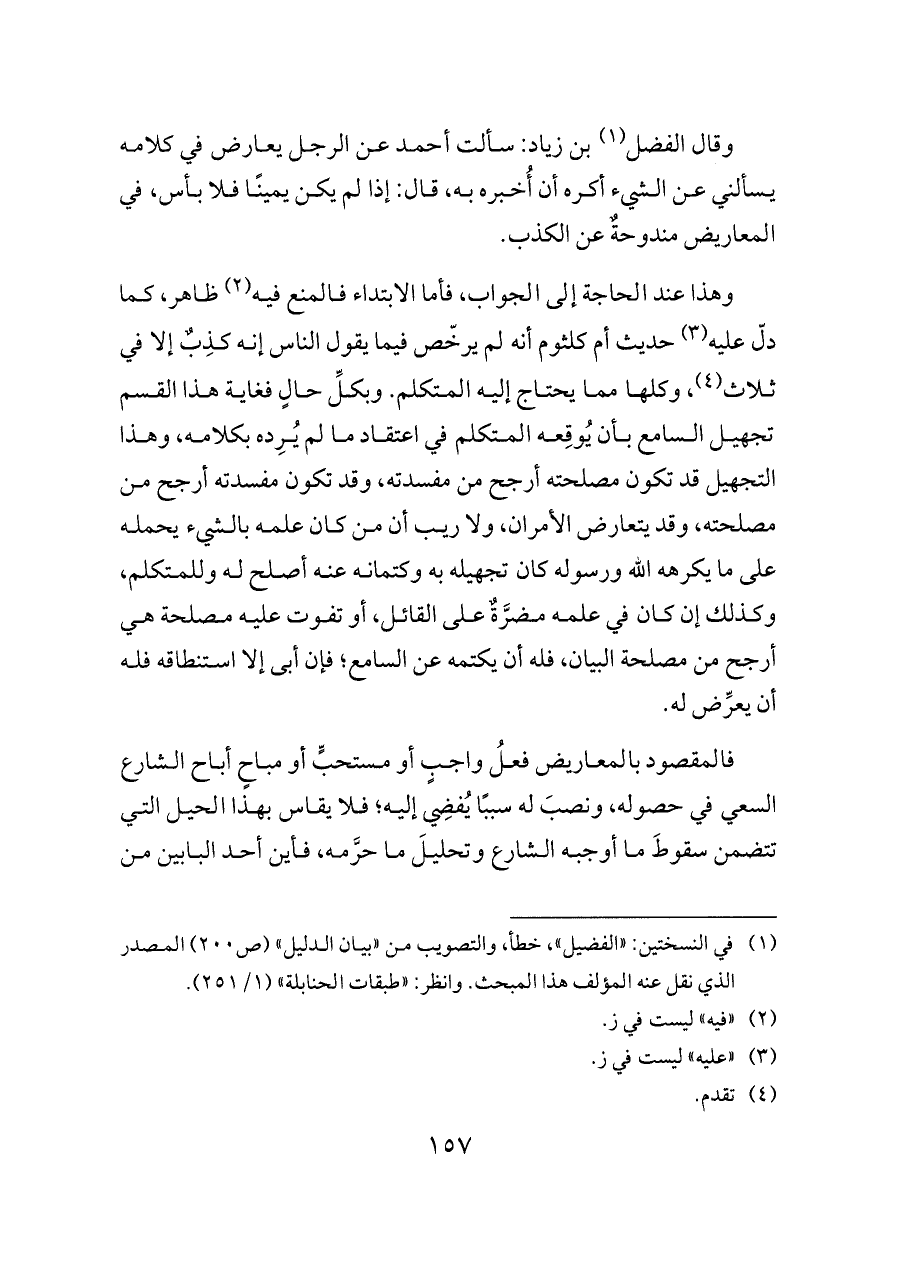 (¬١) في النسختين: «الفضيل»، خطأ، والتصويب من «بيان الدليل» (ص ٢٠٠) المصدر الذي نقل عنه المؤلف هذا المبحث. وانظر: «طبقات الحنابلة» (١/ ٢٥١).