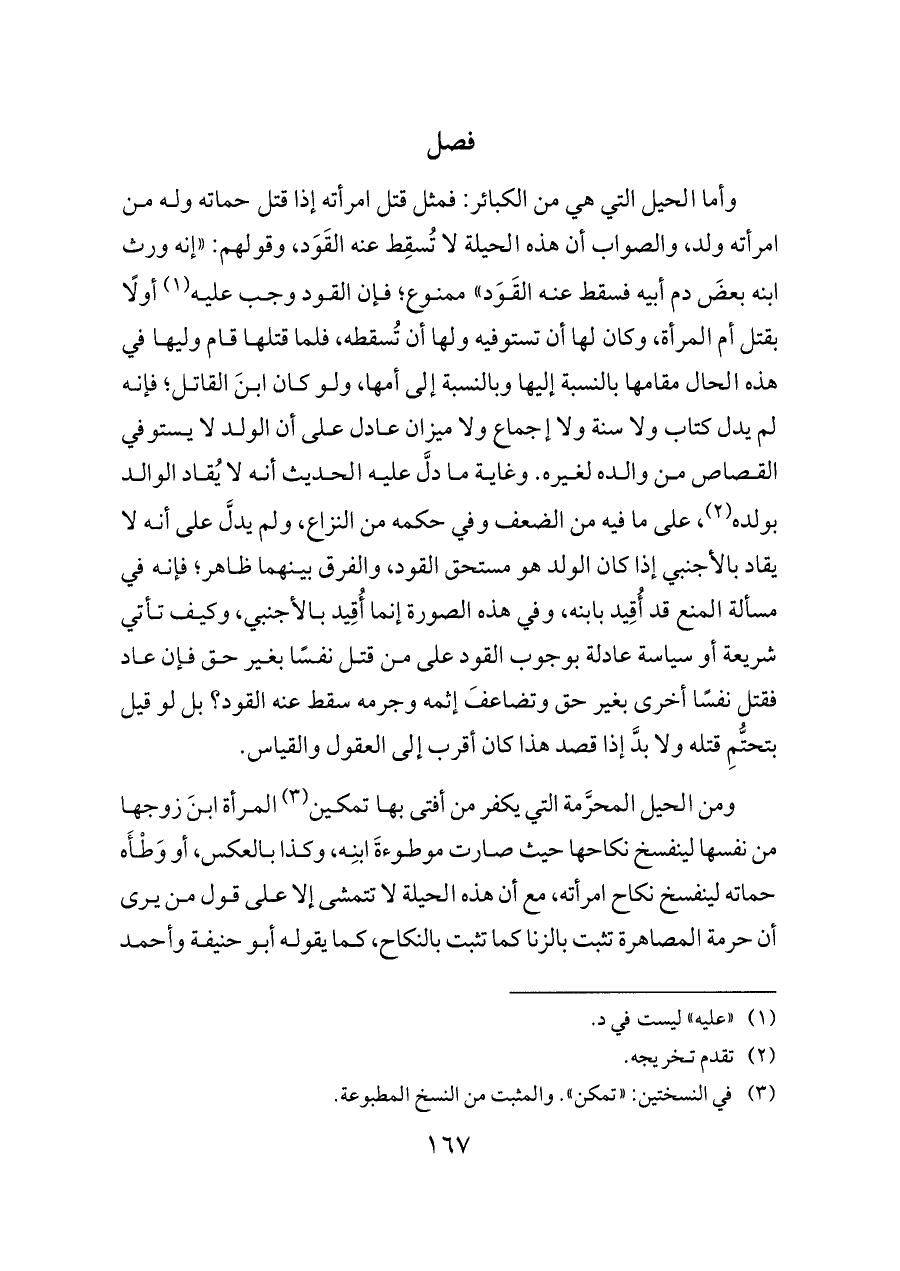 وأما الحيل التي هي من الكبائر: فمثل قتل امرأته إذا قتل حماته وله من امرأته ولد، والصواب أن هذه الحيلة لا تُسقِط عنه القَوَد، وقولهم: «إنه ورث ابنه بعضَ دم أبيه فسقط عنه القَوَد» ممنوع؛ فإن القود وجب عليه (¬١) أولًا بقتل أم المرأة، وكان لها أن تستوفيه ولها أن تُسقطه، فلما قتلها قام وليها في هذه الحال مقامها بالنسبة إليها وبالنسبة إلى أمها، ولو كان ابنَ القاتل؛ فإنه لم يدل كتاب ولا سنة ولا إجماع ولا ميزان عادل على أن الولد لا يستوفي القصاص من والده لغيره. وغاية ما دلَّ عليه الحديث أنه لا يُقاد الوالد بولده (¬٢)، على ما فيه من الضعف وفي حكمه من النزاع، ولم يدلَّ على أنه لا يقاد بالأجنبي إذا كان الولد هو مستحق القود، والفرق بينهما ظاهر؛ فإنه في مسألة المنع قد أُقِيد بابنه، وفي هذه الصورة إنما أُقِيد بالأجنبي، وكيف تأتي شريعة أو سياسة عادلة بوجوب القود على من قتل نفسًا بغير حق فإن عاد فقتل نفسًا أخرى بغير حق وتضاعفَ إثمه وجرمه سقط عنه القود؟ بل لو قيل بتحتُّمِ قتله ولا بدَّ إذا قصد هذا كان أقرب إلى العقول والقياس.
