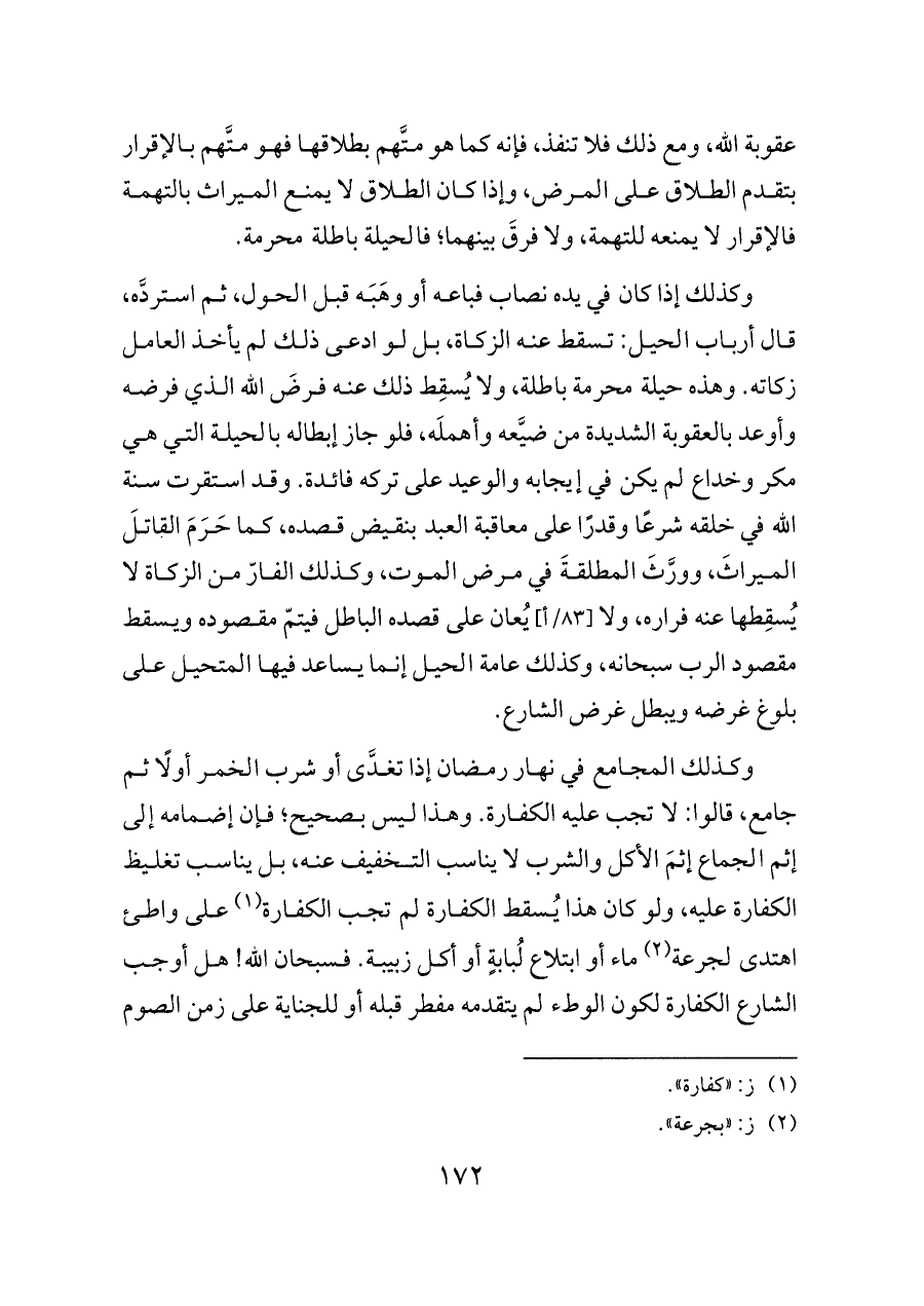 وكذلك إذا كان في يده نصاب فباعه أو وهَبَه قبل الحول، ثم استردَّه، قال أرباب الحيل: تسقط عنه الزكاة، بل لو ادعى ذلك لم يأخذ العامل زكاته. وهذه حيلة محرمة باطلة، ولا يُسقِط ذلك عنه فرضَ الله الذي فرضه وأوعد بالعقوبة الشديدة من ضيَّعه وأهملَه، فلو جاز إبطاله بالحيلة التي هي مكر وخداع لم يكن في إيجابه والوعيد على تركه فائدة. وقد استقرت سنة الله في خلقه شرعًا وقدرًا على معاقبة العبد بنقيض قصده، كما حَرَمَ القاتلَ الميراثَ، وورَّثَ المطلقةَ في مرض الموت، وكذلك الفارّ من الزكاة لا يُسقِطها عنه فراره، ولا [٨٣/أ] يُعان على قصده الباطل فيتمّ مقصوده ويسقط مقصود الرب سبحانه، وكذلك عامة الحيل إنما يساعد فيها المتحيل على بلوغ غرضه ويبطل غرض الشارع.