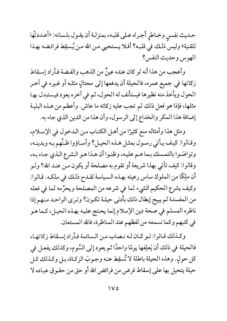 حديث نفسٍ وخاطرٍ أجراه على قلبه، بمنزلة أن يقول بلسانه: «أعددتُها للقنية» وليس ذلك في قلبه؟ أفلا يستحيي من الله من يُسقِط فرائضه بهذا الهوس وحديث النفس؟
