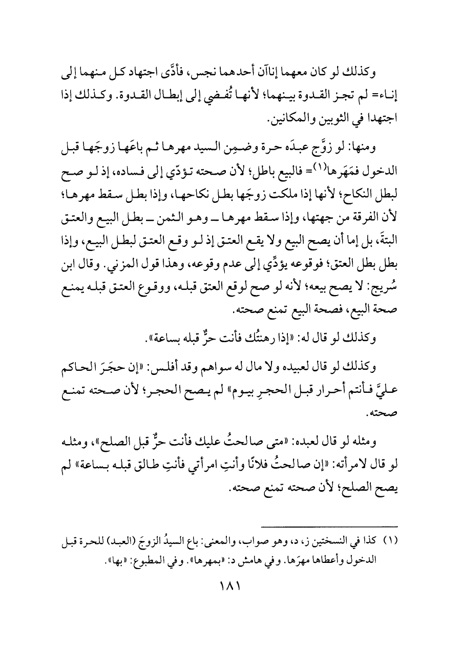 وكذلك لو قال لعبيده ولا مال له سواهم وقد أفلس: «إن حجَرَ الحاكم عليَّ فأنتم أحرار قبل الحجرِ بيوم» لم يصح الحجر؛ لأن صحته تمنع صحته.