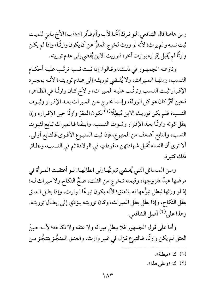 ونازعه الجمهور في ذلك، وقالوا: إذا ثبت نسبه ترتّب عليه أحكام النسب، ومنها الميراث، ولا يُفضي توريثه إلى عدم توريثه؛ لأنه بمجرد الإقرار ثبت النسب وترتَّب عليه الميراث، والأخ كان وارثًا في الظاهر، فحين أقرَّ كان هو كل الورثة، وإنما خرج عن الميراث بعد الإقرار وثبوت النسب؛ فلم يكن توريث الابن مُبطِلًا (¬١) لكون المقرّ وارثًا حين الإقرار، وإن بطل كونه وارثًا بعد الإقرار وثبوت النسب. وأيضًا فالميراث تابع لثبوت النسب، والتابع أضعف من المتبوع، فإذا ثبت المتبوع الأقوى فالتابع أولى. ألا ترى أن النساء تُقبل شهادتهن منفرداتٍ في الولادة ثم في النسب، ونظائر ذلك كثيرة.
