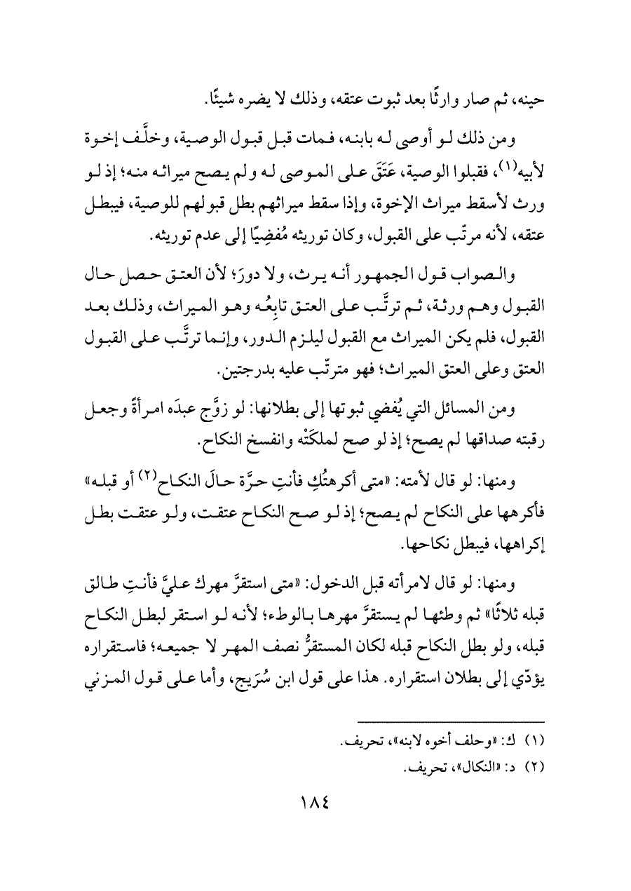 ومن ذلك لو أوصى له بابنه، فمات قبل قبول الوصية، وخلَّف إخوة لأبيه (¬١)، فقبلوا الوصية، عَتَقَ على الموصى له ولم يصح ميراثه منه؛ إذ لو ورث لأسقط ميراث الإخوة، وإذا سقط ميراثهم بطل قبولهم للوصية، فيبطل عتقه، لأنه مرتّب على القبول، وكان توريثه مُفضِيًا إلى عدم توريثه.