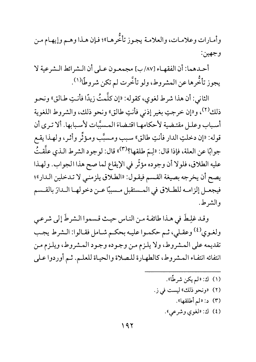 وقد غلِطَ في هذا طائفة من الناس حيث قسموا الشرطَ إلى شرعي ولغوي (¬٤) وعقلي، ثم حكموا عليه بحكم شامل فقالوا: الشرط يجب تقديمه على المشروط، ولا يلزم من وجوده وجود المشروط، ويلزم من انتفائه انتفاء المشروط، كالطهارة للصلاة والحياة للعلم. ثم أوردوا على