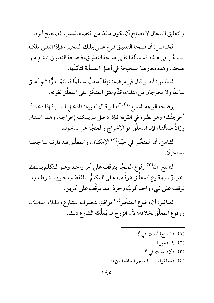 التاسع: أن (¬٣) وقوع المنجَّز يتوقف على أمر واحد وهو التكلم باللفظ اختيارًا، ووقوع المعلَّق يتوقَّف على التكلمُّ باللفظ ووجودِ الشرط، وما توقف على شيء واحد أقربُ وجودًا مما توقَّف على أمرين.