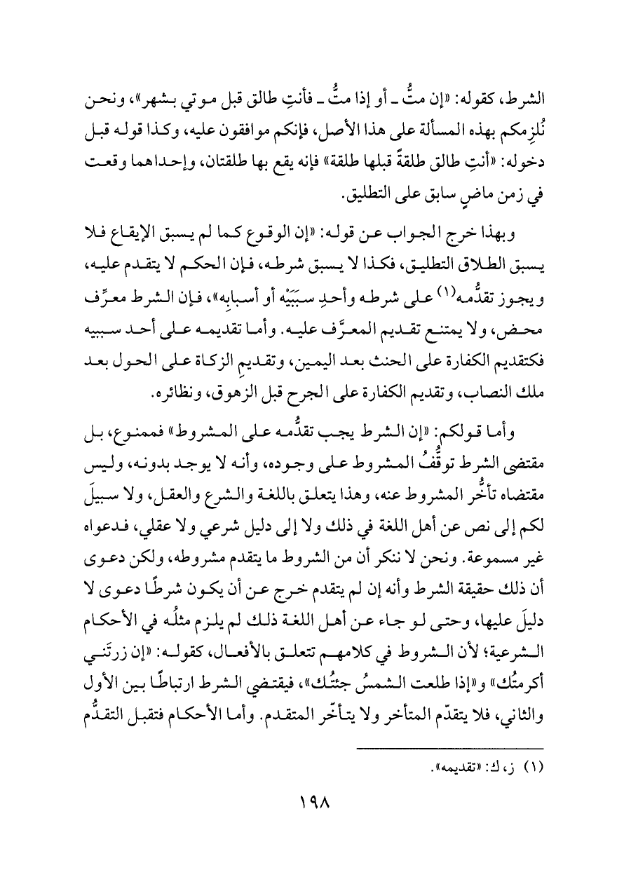 وأما قولكم: «إن الشرط يجب تقدُّمه على المشروط» فممنوع، بل مقتضى الشرط توقُّفُ المشروط على وجوده، وأنه لا يوجد بدونه، وليس مقتضاه تأخُّر المشروط عنه، وهذا يتعلق باللغة والشرع والعقل، ولا سبيلَ لكم إلى نص عن أهل اللغة في ذلك ولا إلى دليل شرعي ولا عقلي، فدعواه غير مسموعة. ونحن لا ننكر أن من الشروط ما يتقدم مشروطه، ولكن دعوى أن ذلك حقيقة الشرط وأنه إن لم يتقدم خرج عن أن يكون شرطًا دعوى لا دليلَ عليها، وحتى لو جاء عن أهل اللغة ذلك لم يلزم مثلُه في الأحكام الشرعية؛ لأن الشروط في كلامهم تتعلق بالأفعال، كقوله: «إن زرتَني أكرمتُك» و «إذا طلعت الشمسُ جئتُك»، فيقتضي الشرط ارتباطًا بين الأول والثاني، فلا يتقدّم المتأخر ولا يتأخّر المتقدم. وأما الأحكام فتقبل التقدُّم