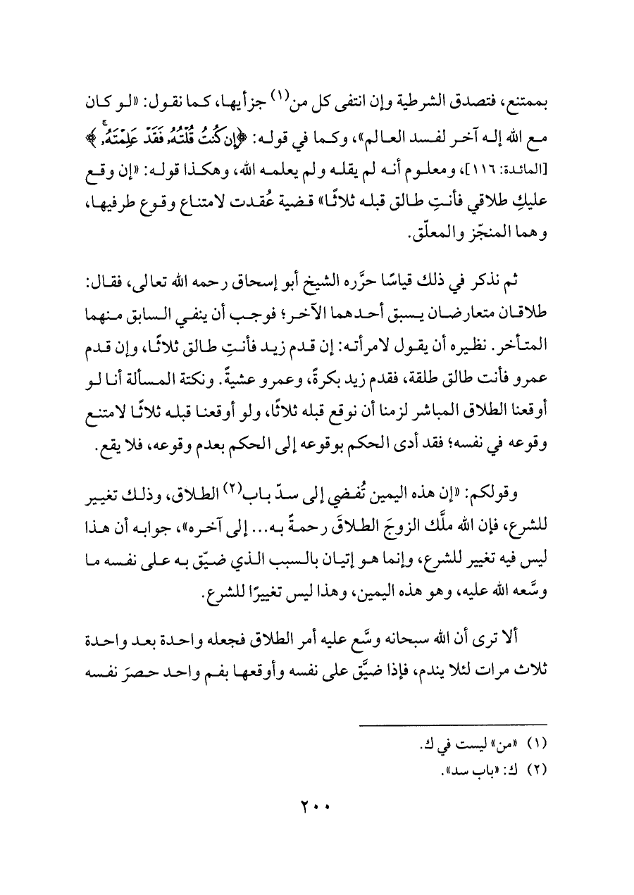 وقولكم: «إن هذه اليمين تُفضي إلى سدّ باب (¬٣) الطلاق، وذلك تغيير للشرع، فإن الله ملَّك الزوجَ الطلاقَ رحمةً به ... إلى آخره»، جوابه أن هذا ليس فيه تغيير للشرع، وإنما هو إتيان بالسبب الذي ضيّق به على نفسه ما وسَّعه الله عليه، وهو هذه اليمين، وهذا ليس تغييرًا للشرع.