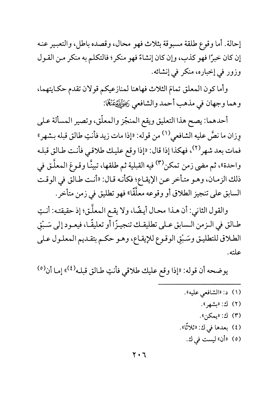 وأما كون المعلق تمامَ الثلاث فهاهنا لمنازعيكم قولان تقدم حكايتهما، وهما وجهان في مذهب أحمد والشافعي - رضي الله عنهما -: