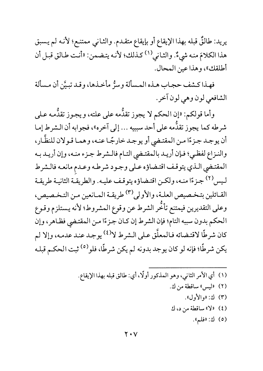 وأما قولكم: «إن الحكم لا يجوز تقدُّمه على علته، ويجوز تقدُّمه على شرطه كما يجوز تقدُّمه على أحد سببيه ... إلى آخره»، فجوابه أن الشرط إما أن يوجد جزءًا من المقتضي أو يوجد خارجًا عنه، وهما قولان للنظَّار، والنزاع لفظي؛ فإن أريد بالمقتضي التام فالشرط جزء منه، وإن أريد به المقتضي الذي يتوقف اقتضاؤه على وجود شرطه وعدمِ مانعه فالشرط ليس (¬٢) جزءًا منه، ولكن اقتضاؤه يتوقف عليه. والطريقة الثانية طريقة القائلين بتخصيص العلة، والأولى (¬٣) طريقة المانعين من التخصيص، وعلى التقديرين فيمتنع تأخُّر الشرط عن وقوع المشروط؛ لأنه يستلزم وقوع الحكم بدون سببه التام؛ فإن الشرط إن كان جزءًا من المقتضي فظاهر، وإن كان شرطًا لاقتضائه فالمعلَّق على الشرط لا (¬٤) يوجد عند عدمه، وإلا لم يكن شرطًا؛ فإنه لو كان يوجد بدونه لم يكن شرطًا، فلو (¬٥) ثبت الحكم قبله