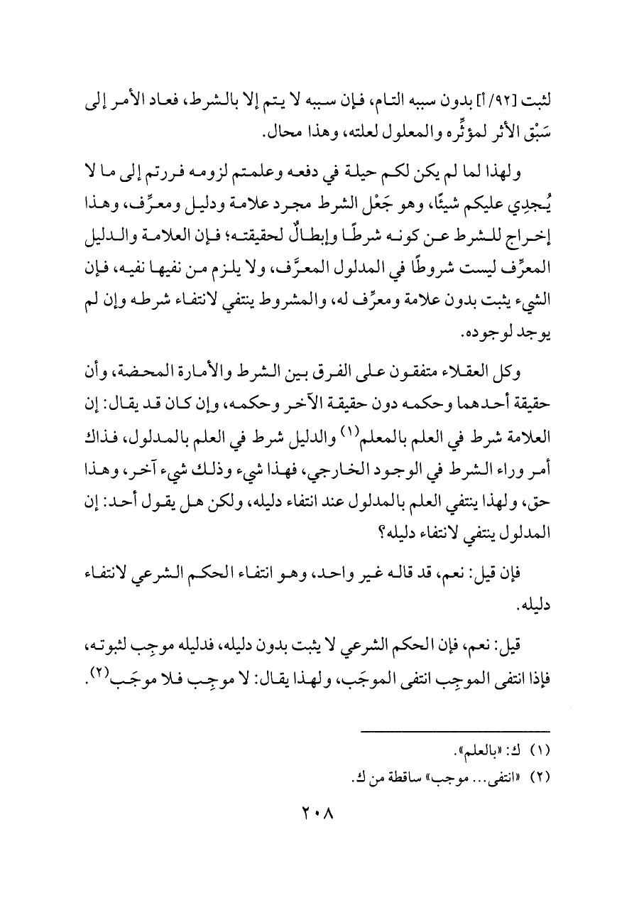 وكل العقلاء متفقون على الفرق بين الشرط والأمارة المحضة، وأن حقيقة أحدهما وحكمه دون حقيقة الآخر وحكمه، وإن كان قد يقال: إن العلامة شرط في العلم بالمعلم (¬١) والدليل شرط في العلم بالمدلول، فذاك أمر وراء الشرط في الوجود الخارجي، فهذا شيء وذلك شيء آخر، وهذا حق، ولهذا ينتفي العلم بالمدلول عند انتفاء دليله، ولكن هل يقول أحد: إن المدلول ينتفي لانتفاء دليله؟