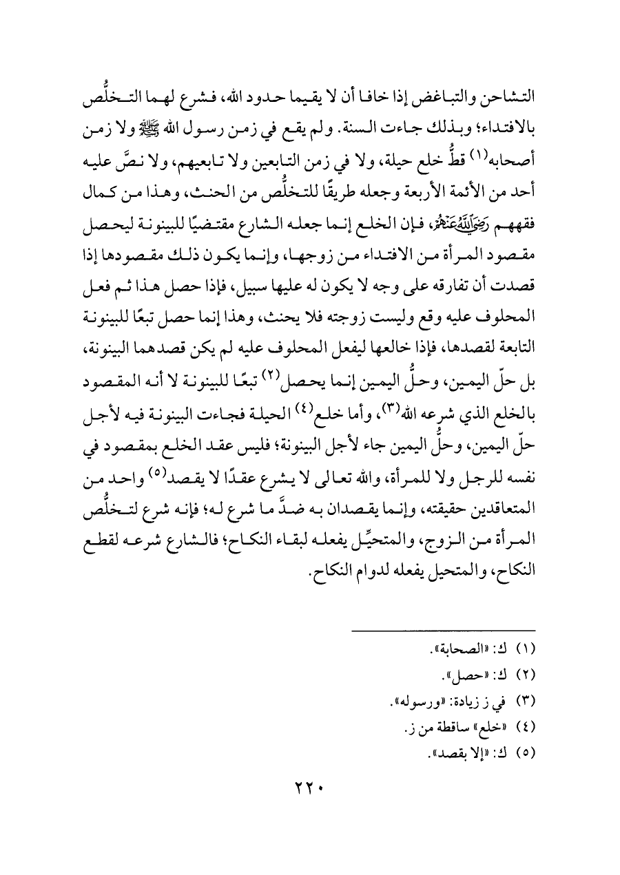 التشاحن والتباغض إذا خافا أن لا يقيما حدود الله، فشرع لهما التخلُّص بالافتداء؛ وبذلك جاءت السنة. ولم يقع في زمن رسول الله - صلى الله عليه وسلم - ولا زمن أصحابه (¬١) قطُّ خلع حيلة، ولا في زمن التابعين ولا تابعيهم، ولا نصَّ عليه أحد من الأئمة الأربعة وجعله طريقًا للتخلُّص من الحنث، وهذا من كمال فقههم - رضي الله عنهم -، فإن الخلع إنما جعله الشارع مقتضيًا للبينونة ليحصل مقصود المرأة من الافتداء من زوجها، وإنما يكون ذلك مقصودها إذا قصدت أن تفارقه على وجه لا يكون له عليها سبيل، فإذا حصل هذا ثم فعل المحلوف عليه وقع وليست زوجته فلا يحنث، وهذا إنما حصل تبعًا للبينونة التابعة لقصدها، فإذا خالعها ليفعل المحلوف عليه لم يكن قصدهما البينونة، بل حلّ اليمين، وحلُّ اليمين إنما يحصل (¬٢) تبعًا للبينونة لا أنه المقصود بالخلع الذي شرعه الله (¬٣)، وأما خلع (¬٤) الحيلة فجاءت البينونة فيه لأجل حلّ اليمين، وحلُّ اليمين جاء لأجل البينونة؛ فليس عقد الخلع بمقصود في نفسه للرجل ولا للمرأة، والله تعالى لا يشرع عقدًا لا يقصد (¬٥) واحد من المتعاقدين حقيقته، وإنما يقصدان به ضدَّ ما شرع له؛ فإنه شرع لتخلُّص المرأة من الزوج، والمتحيِّل يفعله لبقاء النكاح؛ فالشارع شرعه لقطع النكاح، والمتحيل يفعله لدوام النكاح.