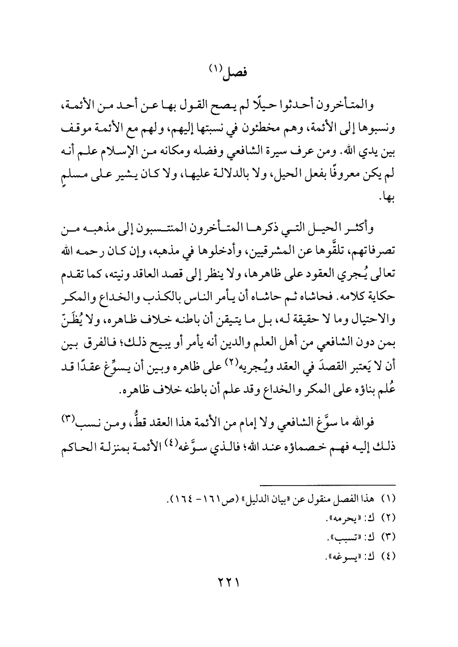 والمتأخرون أحدثوا حيلًا لم يصح القول بها عن أحد من الأئمة، ونسبوها إلى الأئمة، وهم مخطئون في نسبتها إليهم، ولهم مع الأئمة موقف بين يدي الله. ومن عرف سيرة الشافعي وفضله ومكانه من الإسلام علم أنه لم يكن معروفًا بفعل الحيل، ولا بالدلالة عليها، ولا كان يشير على مسلمٍ بها.