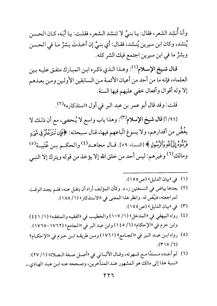 [٩٦/أ] قال شيخ الإسلام (¬٣): وهذا باب واسع لا يُحصى، مع أن ذلك لا يغُضُّ من أقدارهم، ولا يسوغ اتّباعهم فيها، قال سبحانه: {فَإِنْ تَنَازَعْتُمْ فِي شَيْءٍ فَرُدُّوهُ إِلَى اللَّهِ وَالرَّسُولِ} [النساء: ٥٩]. قال مجاهد (¬٤) والحكم بن عُتَيبة (¬٥) ومالك (¬٦) وغيرهم: ليس أحد من خلق الله إلا يؤخذ من قوله ويترك إلا النبي