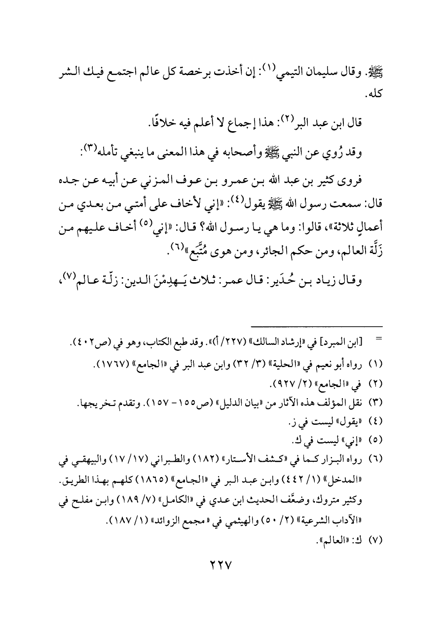 (¬٦) رواه البزار (٣٣٨٤) والطبراني (١٧/ ١٧) والبيهقي في «المدخل» (٨٣٠) وابن عبد البر في «الجامع» (١٨٦٥) كلهم بهذا الطريق. وكثير بن عبد الله بن عمرو بن عوف متروك، والحديث ضعَّفه ابن عدي في «الكامل» (٧/ ١٨٩) وابن مفلح في «الآداب الشرعية» (٢/ ٥٠) والهيثمي في «مجمع الزوائد» (١/ ١٨٧).