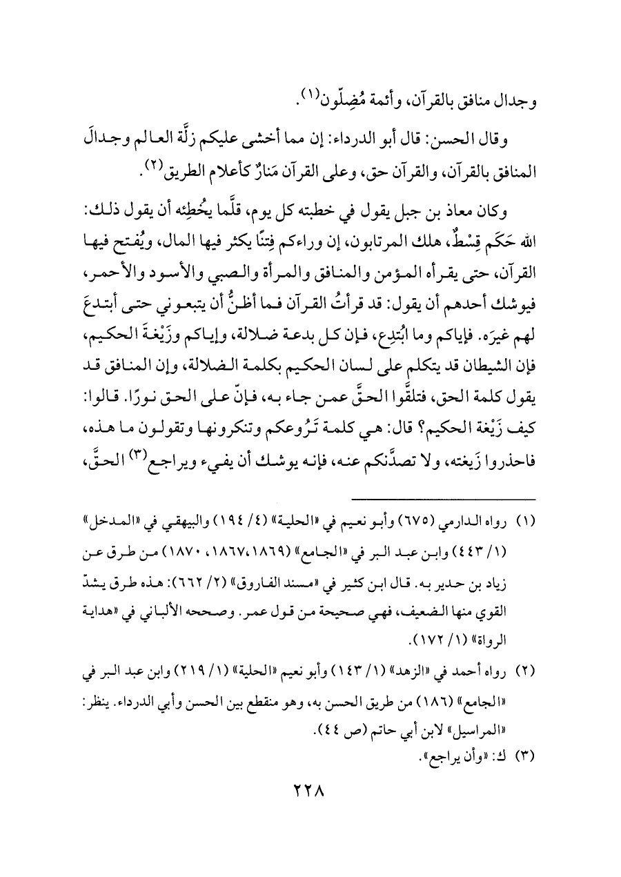 وكان معاذ بن جبل يقول في خطبته كل يوم، قلَّما يُخطِئه أن يقول ذلك: الله حَكَم قِسْطٌ، هلك المرتابون، إن وراءكم فِتنًا يكثر فيها المال، ويُفتح فيها القرآن، حتى يقرأه المؤمن والمنافق والمرأة والصبي والأسود والأحمر، فيوشك أحدهم أن يقول: قد قرأتُ القرآن فما أظنُّ أن يتبعوني حتى أبتدعَ لهم غيرَه. فإياكم وما ابُتدِع، فإن كل بدعة ضلالة، وإياكم وزَيْغةَ الحكيم، فإن الشيطان قد يتكلم على لسان الحكيم بكلمة الضلالة، وإن المنافق قد يقول كلمة الحق، فتلقَّوا الحقَّ عمن جاء به، فإنّ على الحق نورًا. قالوا: كيف زَيْغة الحكيم؟ قال: هي كلمة تَرُوعكم وتنكرونها وتقولون ما هذه، فاحذروا زَيغته، ولا تصدَّنكم عنه، فإنه يوشك أن يفيء ويراجع (¬٣) الحقَّ،