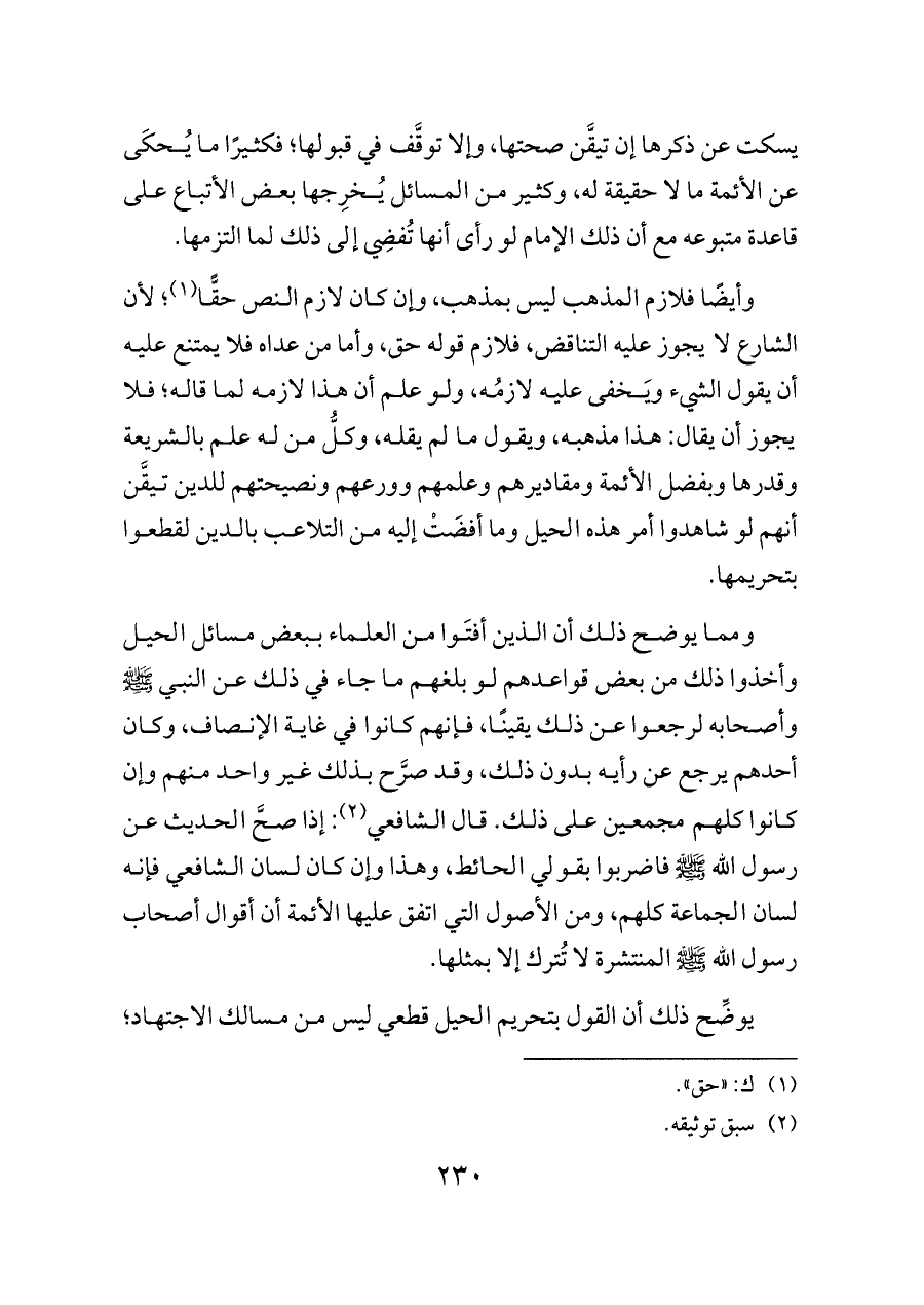 وأيضًا فلازم المذهب ليس بمذهب، وإن كان لازم النص حقًّا (¬١)؛ لأن الشارع لا يجوز عليه التناقض، فلازم قوله حق، وأما من عداه فلا يمتنع عليه أن يقول الشيء ويَخفى عليه لازمُه، ولو علم أن هذا لازمه لما قاله؛ فلا يجوز أن يقال: هذا مذهبه، ويقول ما لم يقله، وكلُّ من له علم بالشريعة وقدرها وبفضل الأئمة ومقاديرهم وعلمهم وورعهم ونصيحتهم للدين تيقَّن أنهم لو شاهدوا أمر هذه الحيل وما أفضَتْ إليه من التلاعب بالدين لقطعوا بتحريمها.