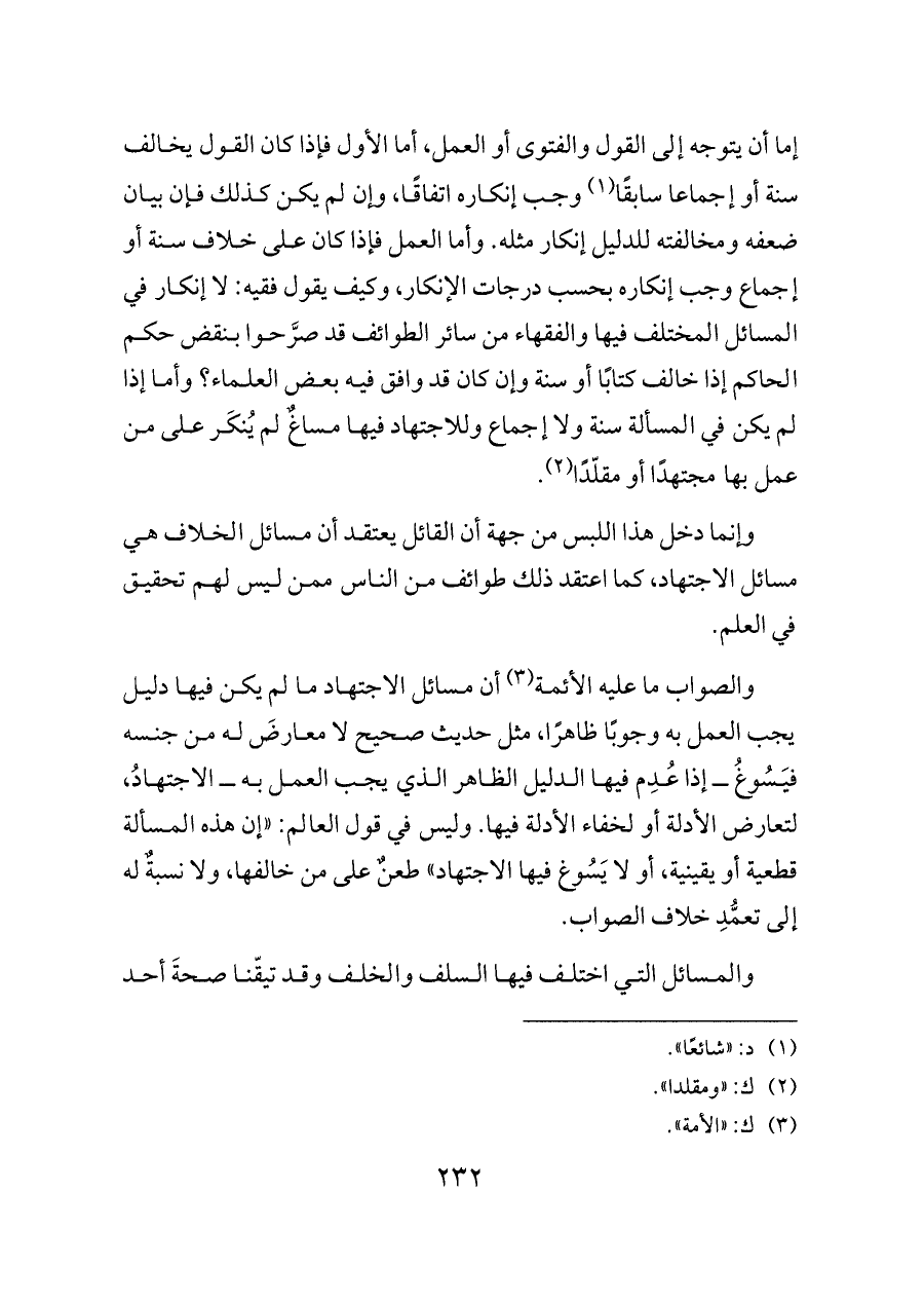 والصواب ما عليه الأئمة (¬٣) أن مسائل الاجتهاد ما لم يكن فيها دليل يجب العمل به وجوبًا ظاهرًا، مثل حديث صحيح لا معارضَ له من جنسه فيَسُوغُ ــ إذا عُدِم فيها الدليل الظاهر الذي يجب العمل به ــ الاجتهادُ، لتعارض الأدلة أو لخفاء الأدلة فيها. وليس في قول العالم: «إن هذه المسألة قطعية أو يقينية، أو لا يَسُوغ فيها الاجتهاد» طعنٌ على من خالفها، ولا نسبةٌ له إلى تعمُّدِ خلاف الصواب.