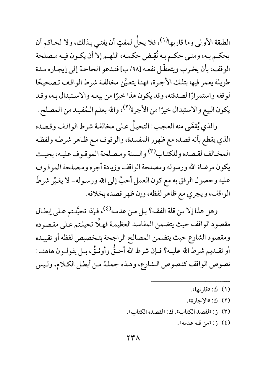 والذي يُقضَى منه العجب: التحيلُ على مخالفة شرط الواقف وقصده الذي يقطع بأنه قصده مع ظهور المفسدة، والوقوف مع ظاهر شرطه ولفظه المخالف لقصده وللكتاب (¬٣) والسنة ومصلحة الموقوف عليه، بحيث يكون مرضاة الله ورسوله ومصلحة الواقف وزيادة أجره ومصلحة الموقوف عليه وحصول الرفق به مع كون العمل أحبَّ إلى الله ورسوله= لا يغيِّر شرطَ الواقف، ويجري مع ظاهر لفظه، وإن ظهر قصده بخلافه.
