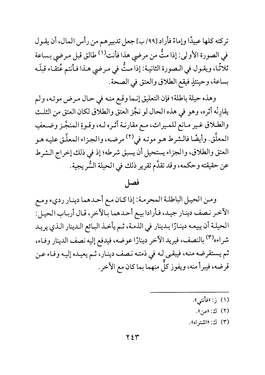 وهذه حيلة باطلة؛ فإن التعليق إنما وقع منه في حال مرض موته، ولم يقارِنْه أثره، وهو في هذه الحال لو نجَّز العتق والطلاق لكان العتق من الثلث والطلاق غير مانع للميراث، مع مقارنة أثره له، وقوةِ المنجَّز وضعفِ المعلَّق. وأيضًا فالشرط هو موته في (¬٢) مرضه، والجزاء المعلَّق عليه هو العتق والطلاق، والجزاء يستحيل أن يسبق شرطه؛ إذ في ذلك إخراج الشرط عن حقيقته وحكمه، وقد تقدَّم تقرير ذلك في الحيلة السُّريجية.