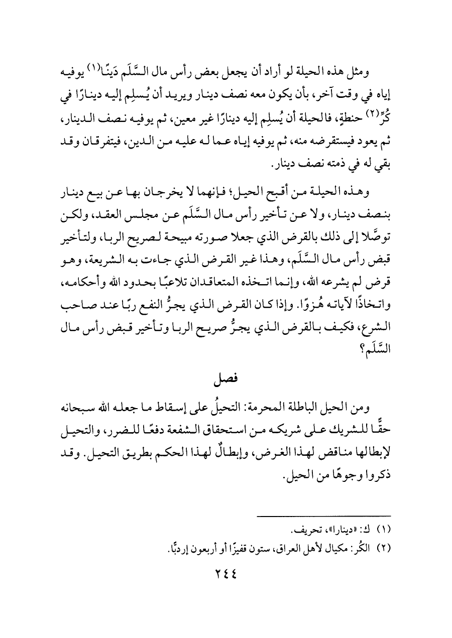 ومثل هذه الحيلة لو أراد أن يجعل بعض رأس مال السَّلَم دَينًا (¬١) يوفيه إياه في وقت آخر، بأن يكون معه نصف دينار ويريد أن يُسلِم إليه دينارًا في كُرِّ (¬٢) حنطةٍ، فالحيلة أن يُسلِم إليه دينارًا غير معين، ثم يوفيه نصف الدينار، ثم يعود فيستقرضه منه، ثم يوفيه إياه عما له عليه من الدين، فيتفرقان وقد بقي له في ذمته نصف دينار.