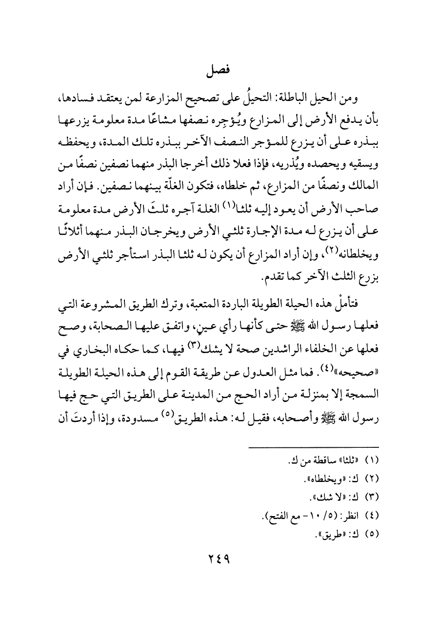 ومن الحيل الباطلة: التحيلُ على تصحيح المزارعة لمن يعتقد فسادها، بأن يدفع الأرض إلى المزارع ويُؤجِره نصفها مشاعًا مدة معلومة يزرعها ببذره على أن يزرع للمؤجر النصف الآخر ببذره تلك المدة، ويحفظه ويسقيه ويحصده ويُذريه، فإذا فعلا ذلك أخرجا البذر منهما نصفين نصفًا من المالك ونصفًا من المزارع، ثم خلطاه، فتكون الغلّة بينهما نصفين. فإن أراد صاحب الأرض أن يعود إليه ثلثا (¬١) الغلة آجره ثلثَ الأرض مدة معلومة على أن يزرع له مدة الإجارة ثلثي الأرض ويخرجان البذر منهما أثلاثًا ويخلطانه (¬٢)، وإن أراد المزارع أن يكون له ثلثا البذر استأجر ثلثي الأرض بزرع الثلث الآخر كما تقدم.