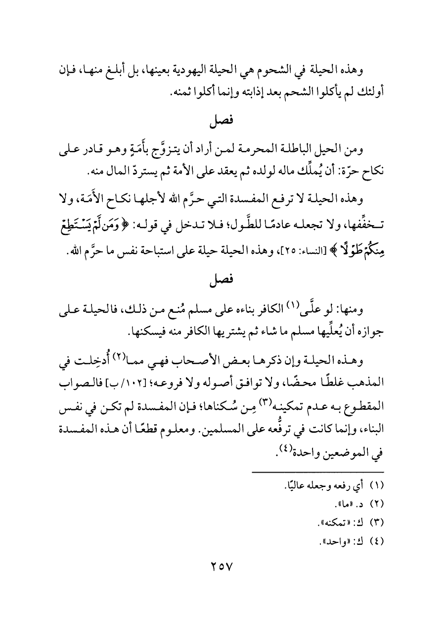 وهذه الحيلة وإن ذكرها بعض الأصحاب فهي مما (¬٢) أُدخِلت في المذهب غلطًا محضًا، ولا توافق أصوله ولا فروعه؛ [١٠٢/ب] فالصواب المقطوع به عدم تمكينه (¬٣) مِن سُكناها؛ فإن المفسدة لم تكن في نفس البناء، وإنما كانت في ترفُّعه على المسلمين. ومعلوم قطعًا أن هذه المفسدة في الموضعين واحدة (¬٤).