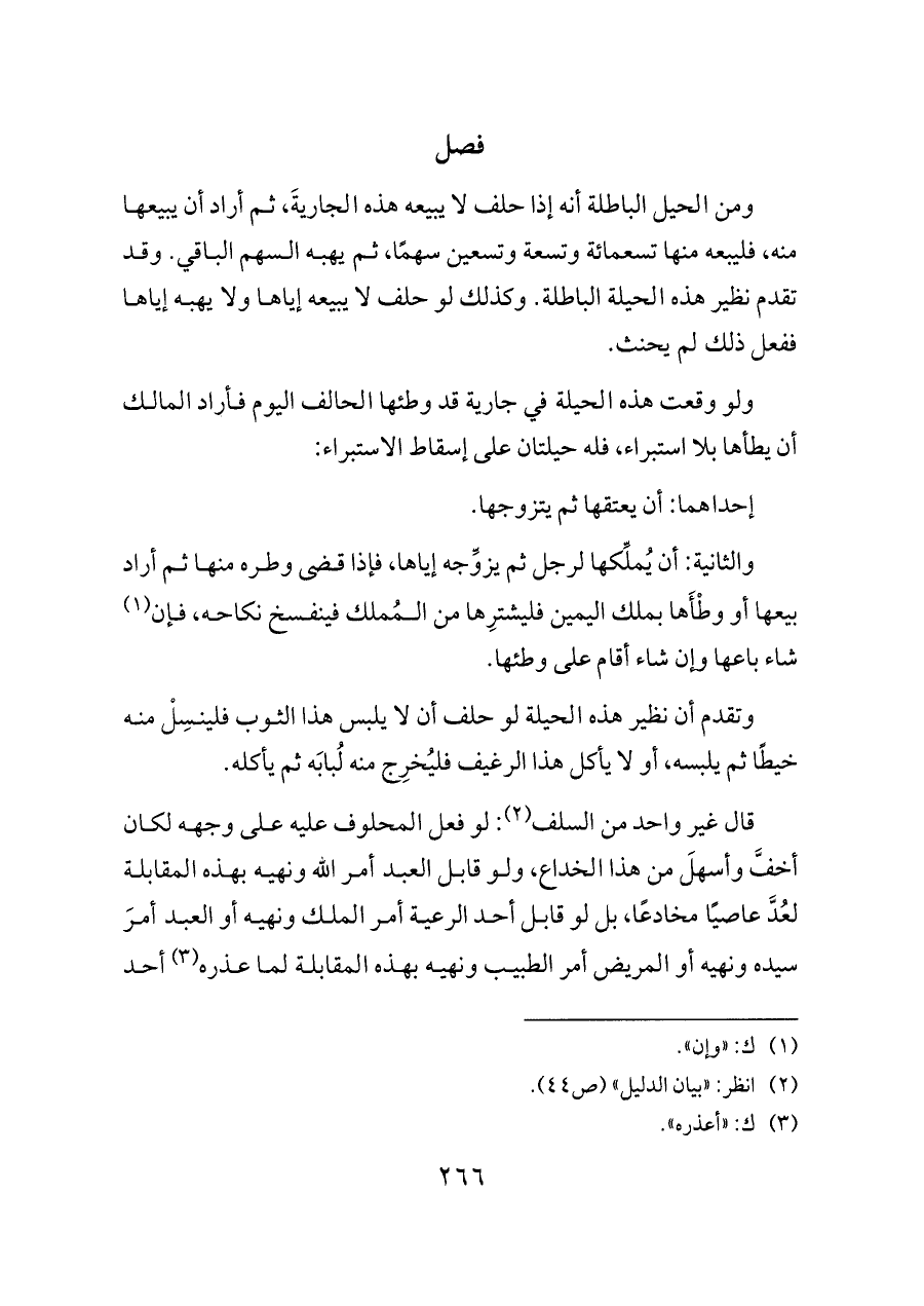 ومن الحيل الباطلة أنه إذا حلف لا يبيعه هذه الجاريةَ، ثم أراد أن يبيعها منه، فليبعه منها تسعمائة وتسعة وتسعين سهمًا، ثم يهبه السهم الباقي. وقد تقدم نظير هذه الحيلة الباطلة. وكذلك لو حلف لا يبيعه إياها ولا يهبه إياها ففعل ذلك لم يحنث.