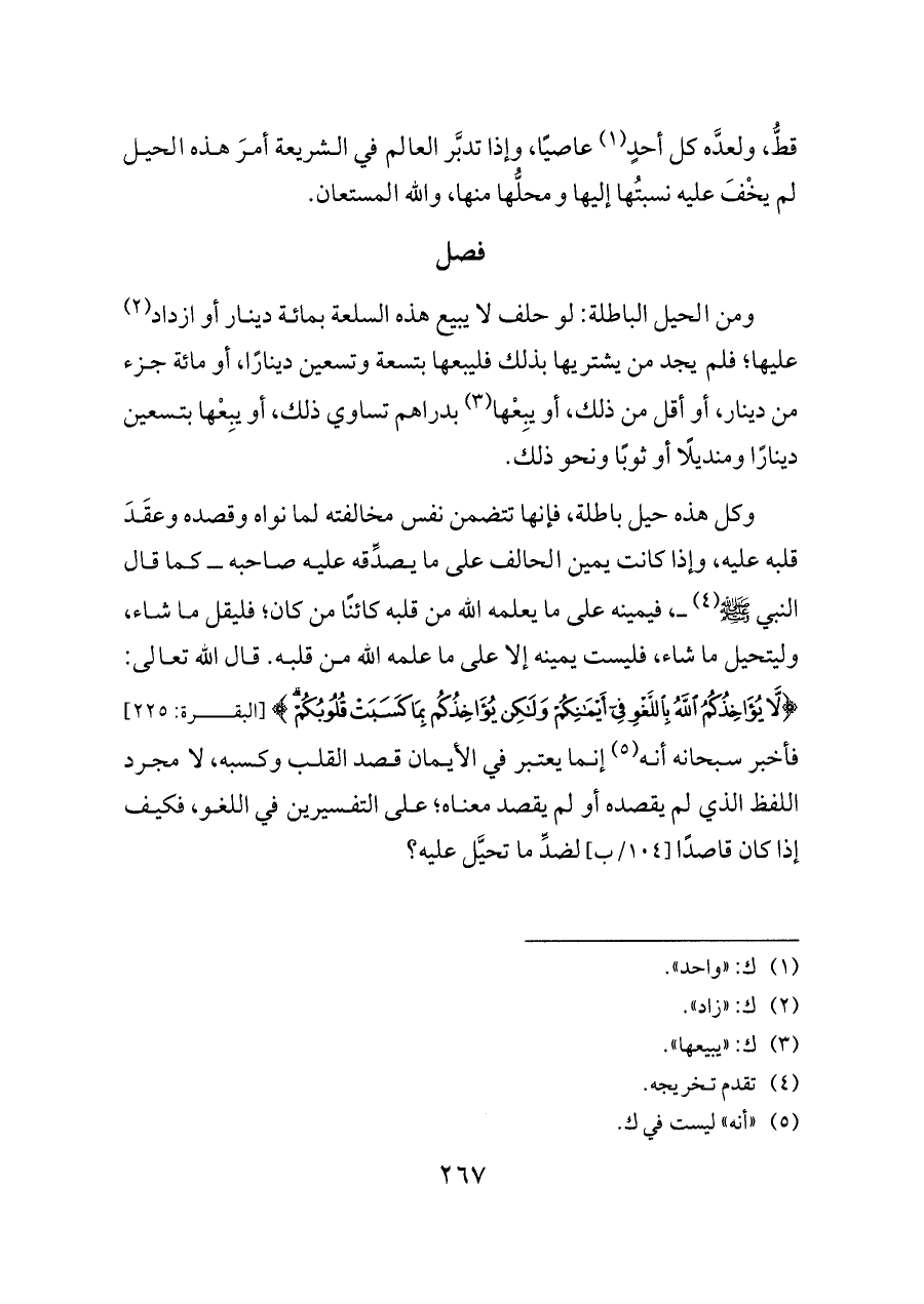 ومن الحيل الباطلة: لو حلف لا يبيع هذه السلعة بمائة دينار أو ازداد (¬٢) عليها؛ فلم يجد من يشتريها بذلك فليبعها بتسعة وتسعين دينارًا، أو مائة جزء من دينار، أو أقل من ذلك، أو يبِعْها (¬٣) بدراهم تساوي ذلك، أو يبِعْها بتسعين دينارًا ومنديلًا أو ثوبًا ونحو ذلك.