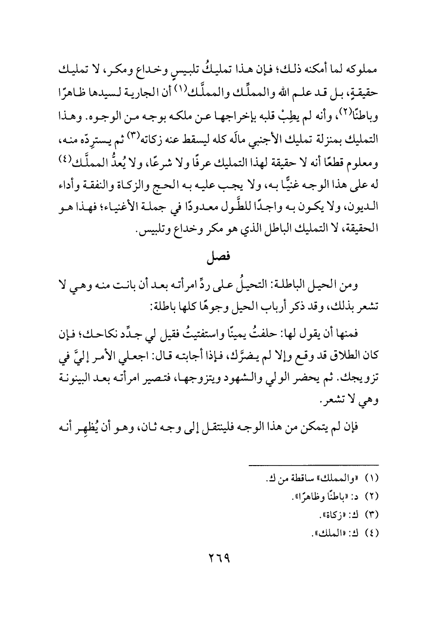 مملوكه لما أمكنه ذلك؛ فإن هذا تمليكُ تلبيسٍ وخداع ومكر، لا تمليك حقيقةٍ، بل قد علم الله والمملِّك والمملَّك (¬١) أن الجارية لسيدها ظاهرًا وباطنًا (¬٢)، وأنه لم يطِبْ قلبه بإخراجها عن ملكه بوجه من الوجوه. وهذا التمليك بمنزلة تمليك الأجنبي مالَه كله ليسقط عنه زكاته (¬٣) ثم يسترِدّه منه، ومعلوم قطعًا أنه لا حقيقة لهذا التمليك عرفًا ولا شرعًا، ولا يُعدُّ المملَّك (¬٤) له على هذا الوجه غنيًّا به، ولا يجب عليه به الحج والزكاة والنفقة وأداء الديون، ولا يكون به واجدًا للطَّول معدودًا في جملة الأغنياء؛ فهذا هو الحقيقة، لا التمليك الباطل الذي هو مكر وخداع وتلبيس.