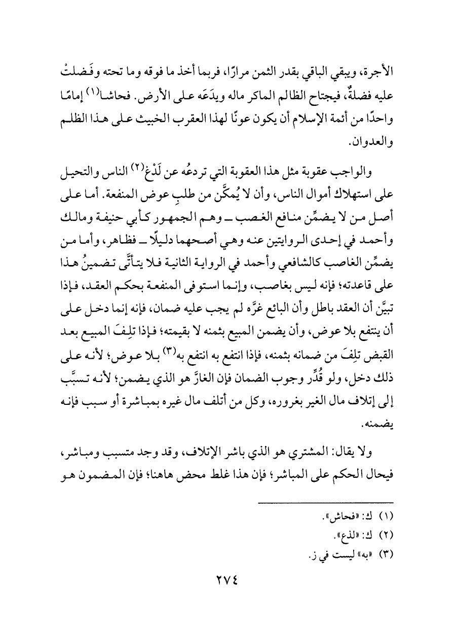 الأجرة، ويبقي الباقي بقدر الثمن مرارًا، فربما أخذ ما فوقه وما تحته وفَضلتْ عليه فضلةٌ، فيجتاح الظالم الماكر ماله ويدَعَه على الأرض. فحاشا (¬١) إمامًا واحدًا من أئمة الإسلام أن يكون عونًا لهذا العقرب الخبيث على هذا الظلم والعدوان.