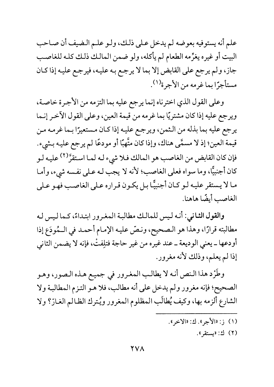 والقول الثاني: أنه ليس للمالك مطالبة المغرور ابتداءً، كما ليس له مطالبته قرارًا، وهذا هو الصحيح، ونصّ عليه الإمام أحمد في المُودَع إذا أودعها ــ يعني الوديعة ــ عند غيره من غير حاجة فتلِفتْ، فإنه لا يضمن الثاني إذا لم يعلم، وذلك لأنه مغرور.