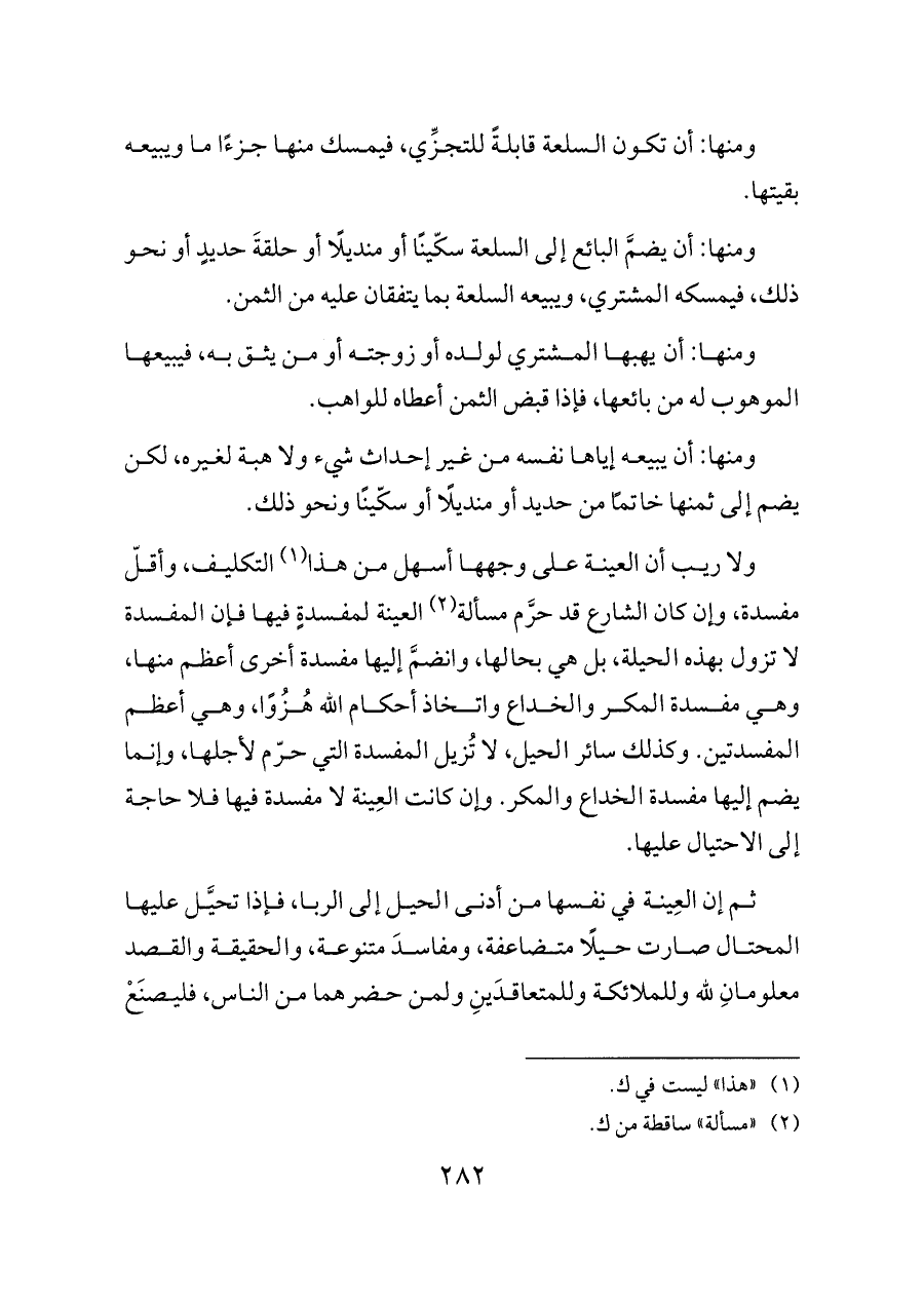 ثم إن العِينة في نفسها من أدنى الحيل إلى الربا، فإذا تحيَّل عليها المحتال صارت حيلًا متضاعفة، ومفاسدَ متنوعة، والحقيقة والقصد معلومانِ لله وللملائكة وللمتعاقدَينِ ولمن حضرهما من الناس، فليصنَعْ