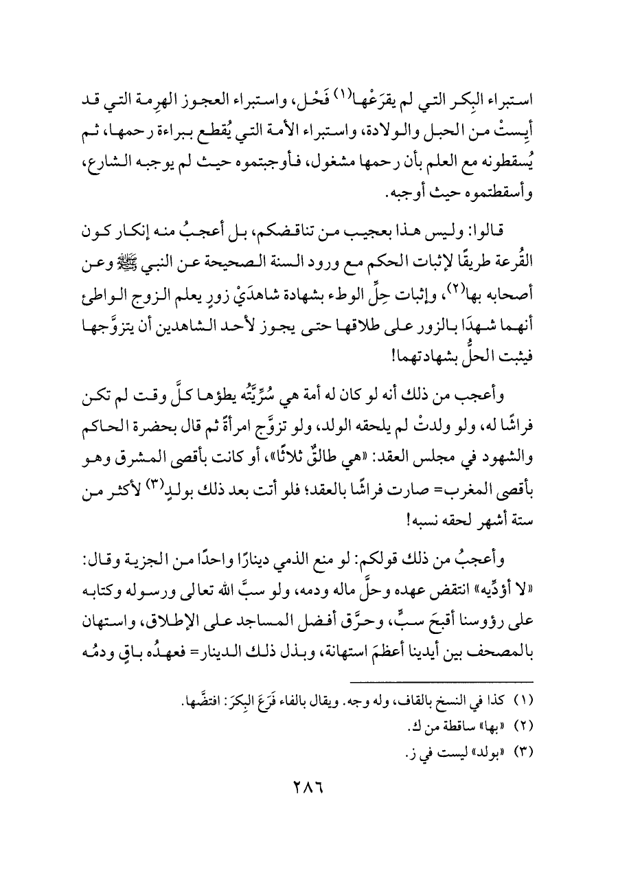 قالوا: وليس هذا بعجيب من تناقضكم، بل أعجبُ منه إنكار كون القُرعة طريقًا لإثبات الحكم مع ورود السنة الصحيحة عن النبي - صلى الله عليه وسلم - وعن أصحابه بها (¬٢)، وإثبات حِلِّ الوطء بشهادة شاهدَيْ زورٍ يعلم الزوج الواطئ أنهما شهدَا بالزور على طلاقها حتى يجوز لأحد الشاهدين أن يتزوَّجها فيثبت الحلُّ بشهادتهما!
