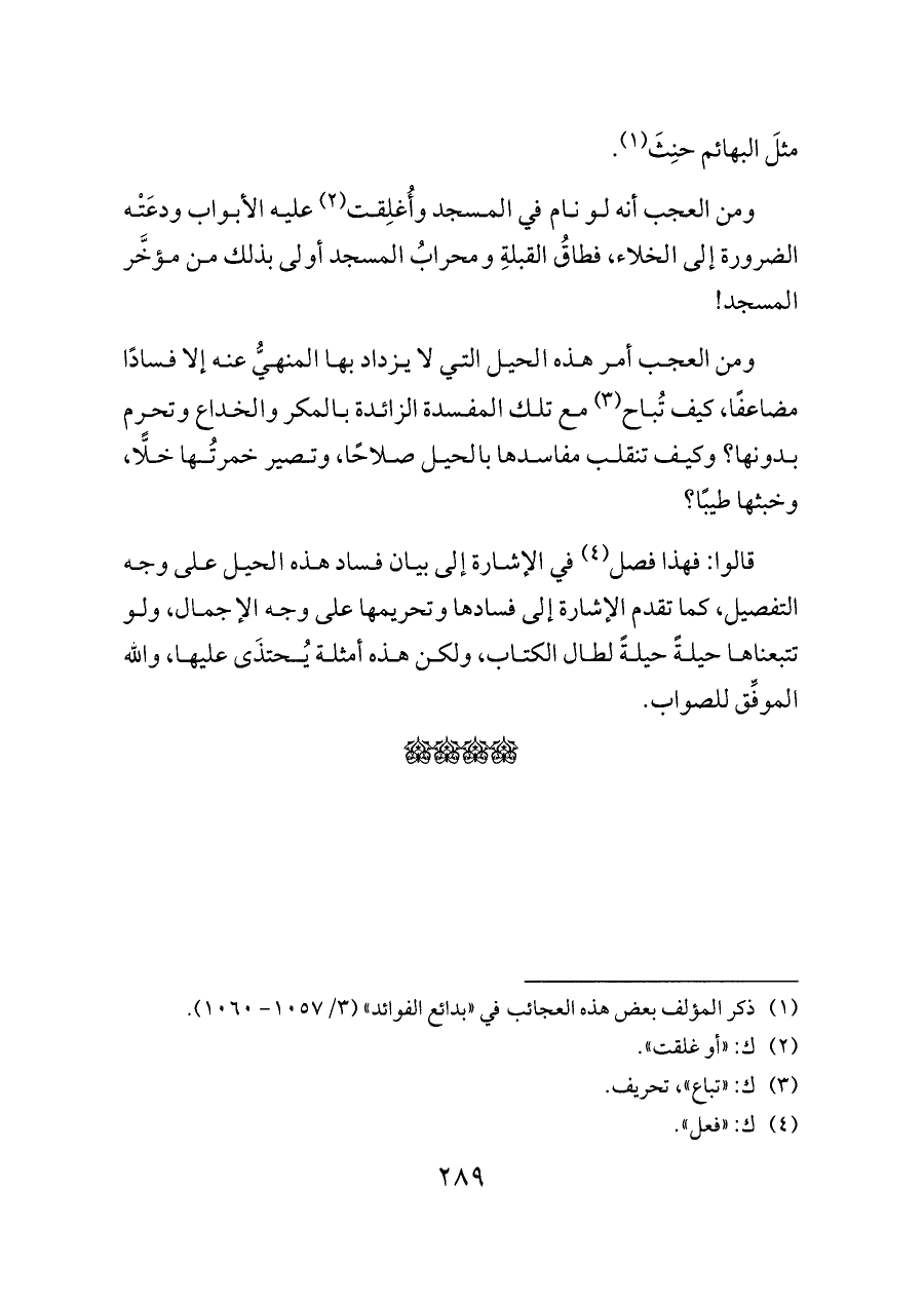 قالوا: فهذا فصل (¬٤) في الإشارة إلى بيان فساد هذه الحيل على وجه التفصيل، كما تقدم الإشارة إلى فسادها وتحريمها على وجه الإجمال، ولو تتبعناها حيلةً حيلةً لطال الكتاب، ولكن هذه أمثلة يُحتذَى عليها، والله الموفِّق للصواب.
