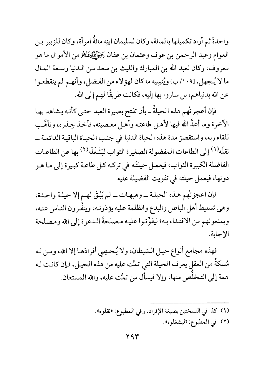 واحدةً ثم أراد تكميلها بالمائة، وكان لسليمان ابنِه مائةُ امرأة، وكان للزبير بن العوام وعبد الرحمن بن عوف وعثمان بن عفان - رضي الله عنهم - من الأموال ما هو معروف، وكان لعبد الله بن المبارك والليث بن سعد من الدنيا وسعة المال ما لا يُجهل، [١٠٩/ب] ويُنسِيه ما كان لهؤلاء من الفضل، وأنهم لم ينقطعوا عن الله بدنياهم، بل ساروا بها إليه، فكانت طريقًا لهم إلى الله.