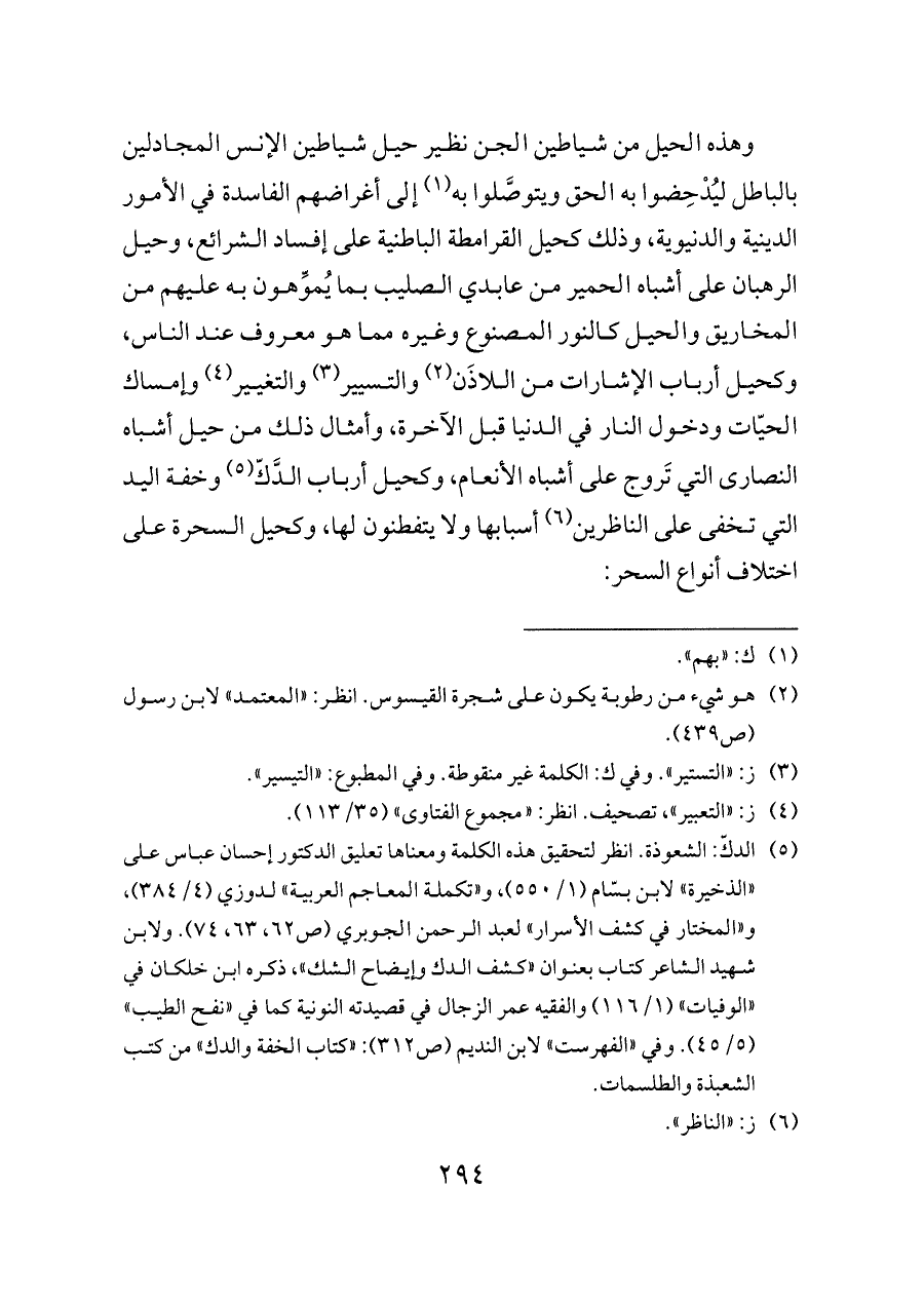 وهذه الحيل من شياطين الجن نظير حيل شياطين الإنس المجادلين بالباطل ليُدْحِضوا به الحق ويتوصَّلوا به (¬١) إلى أغراضهم الفاسدة في الأمور الدينية والدنيوية، وذلك كحيل القرامطة الباطنية على إفساد الشرائع، وحيل الرهبان على أشباه الحمير من عابدي الصليب بما يُموِّهون به عليهم من المخاريق والحيل كالنور المصنوع وغيره مما هو معروف عند الناس، وكحيل أرباب الإشارات من اللاذَن (¬٢) والتسيير (¬٣) والتغيير (¬٤) وإمساك الحيّات ودخول النار في الدنيا قبل الآخرة، وأمثال ذلك من حيل أشباه النصارى التي تَروج على أشباه الأنعام، وكحيل أرباب الدَّكّ (¬٥) وخفة اليد التي تخفى على الناظرين (¬٦) أسبابها ولا يتفطنون لها، وكحيل السحرة على اختلاف أنواع السحر: